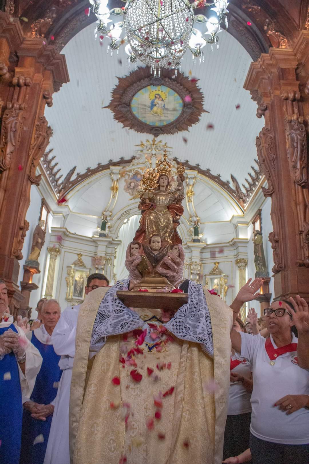 Após nove dias de preparação, chegamos ao tão esperado 8 de setembro, Festa da Natividade de Nossa Senhora, que por providência neste ano ocorreu no domingo. Nosso Bispo, Dom Pedro Cunha Cruz, presidiu a Solenidade da Padroeira, às 10h. Em sua bela homilia, nosso Bispo diocesano ressaltou a importância de Maria no mistério da salvação, ou seja, ela nasce justamente para ser Mãe de Jesus. Após a celebração, aconteceu um dos momentos mais aguardados, iluminados pelas sábias palavras do Diácono Tobias de Oliveira Coelho, presenciamos a descida da imagem de Nossa Senhora do Montserrat de seu trono. Cantando e rezando: “Vem Maria, Vem!” acompanhamos, emocionados, a passagem da imagem em meio a assembleia. Quando de seu retorno, estando abaixo da cúpula da igreja, uma linda chuva de pétalas derramou-se sobre a imagem, nos enchendo de profunda alegria e esperança, pois se por um lado aquela era nossa homenagem, por outro, em cada pétala víamos o sinal das inúmeras graças que por intercessão da Senhora de Montserrat eram derramadas sobre todos.