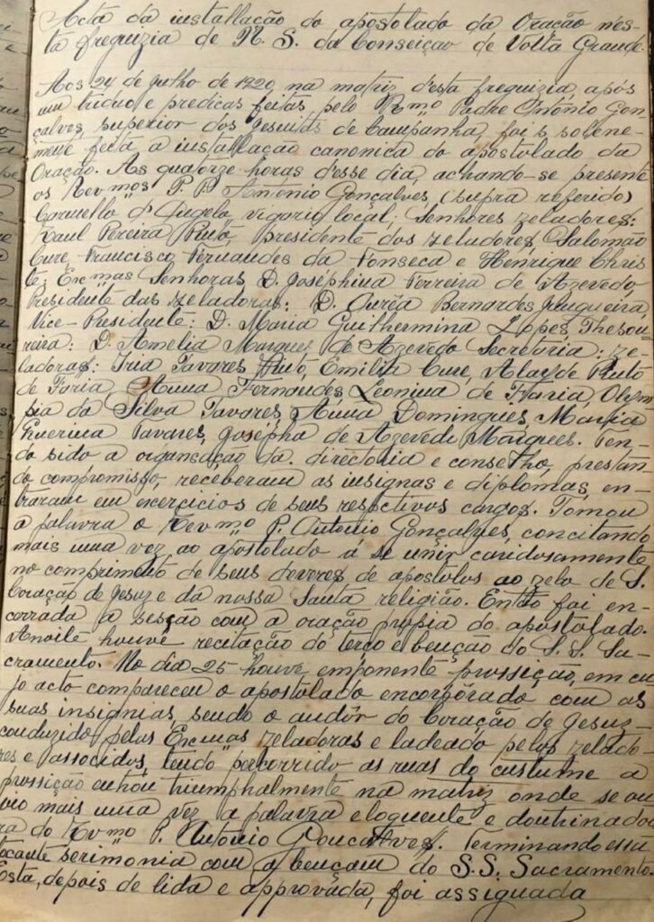 “Aos 24 de julho de 1920 na matriz d’esta freguesia, após um tríduo e prédicas feitas pelo Rvmo. Padre Antonio Gonçalvez, superior do jesuítas de Campanha, foi solenemente feita a instalação canônica do Oração. Às quatorze horas d’esse dia, achando-se presentes os Revmos. P.P. Antonio Gonçalves (supra referido), Carmello d’Angelo, vigário local; Senhores zeladores: Raul Pereira Pinto, presidente dos zeladores, Salomão Cure, Francisco Fernandes da Fonseca e Henrique Christe; Exmas. Senhoras D. Josephina Ferreira de Azevedo, Presidente das zeladoras; D. Aurêa Bernardes Junqueira, Vice-Presidente; D. Maria Guilhermina Lopes, Thesoureira; D. Amelia Marques de Azevedo, Secretária; Zeladoras: Iria Tavares Pinto, Emilia Cure, Alayde Pinto de Faria, Anna Fernandes Leonina de Faria, Olympia da Silva Tavares, Anna Domingues, Maria Pereira Tavares, Josepha de Azevedo Marques. Tendo sido a organização da directoria e conselho, prestando compromisso, receberam os insígnias e diplomas, entraram em exercícios de seus respectivos cargos. Tomou a palavra o Revmo. P. Antonio Gonçalves, concitando mais uma vez ao apostolado a se unir caridosamente no comprimento de seus deveres de apóstolos ao zelo de S. Coração de Jesuz e da nossa Santa religião. Então foi encerrada a sesão com a oração própia do apostolado. Anoite houve recitação do terço e benção do S. S. Sacramento. No dia 25 houve emponente prossição, em cujo acto compareceu o apostolado incorporado com as suas insígnias, sendo o andor do Coração de Jesus conduzido pelas Exmas. Zeladoras e ladeado pelos zeladores e associados, tendo percorrido as ruas de costume a prossição entrou triumphalmente na matriz onde se ouviu mais uma vez a palavra eloquente e doutrinadora do Revmo. P. Antonio Gonçalves. Terminando essa tocante serimonia com a benção do S. S. Sacramento. Esta, depois de lida e aprovada, foi assignada”.