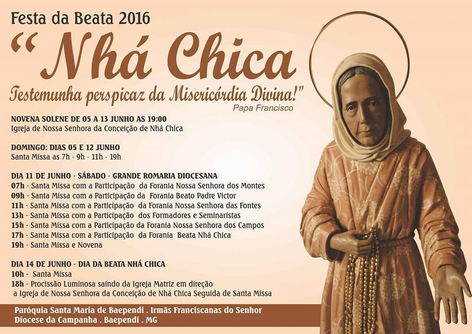 Beata Nhá Chica – Festividades De 5 a 14 de junho acontecem as festividades em honra à Beata Nhá Chica com novena e missas.Ressaltamos, 7 de junho de 2016
