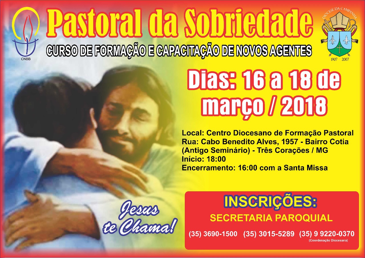 Pastoral da Sobriedade – Curso de Formação e Capacitação de Novos Agentes A Pastoral da Sobriedade por sua coordenadora diocesana, Sra. Cida Furtado, faz convite para a formação que acontecerá em 4 de março de 2018