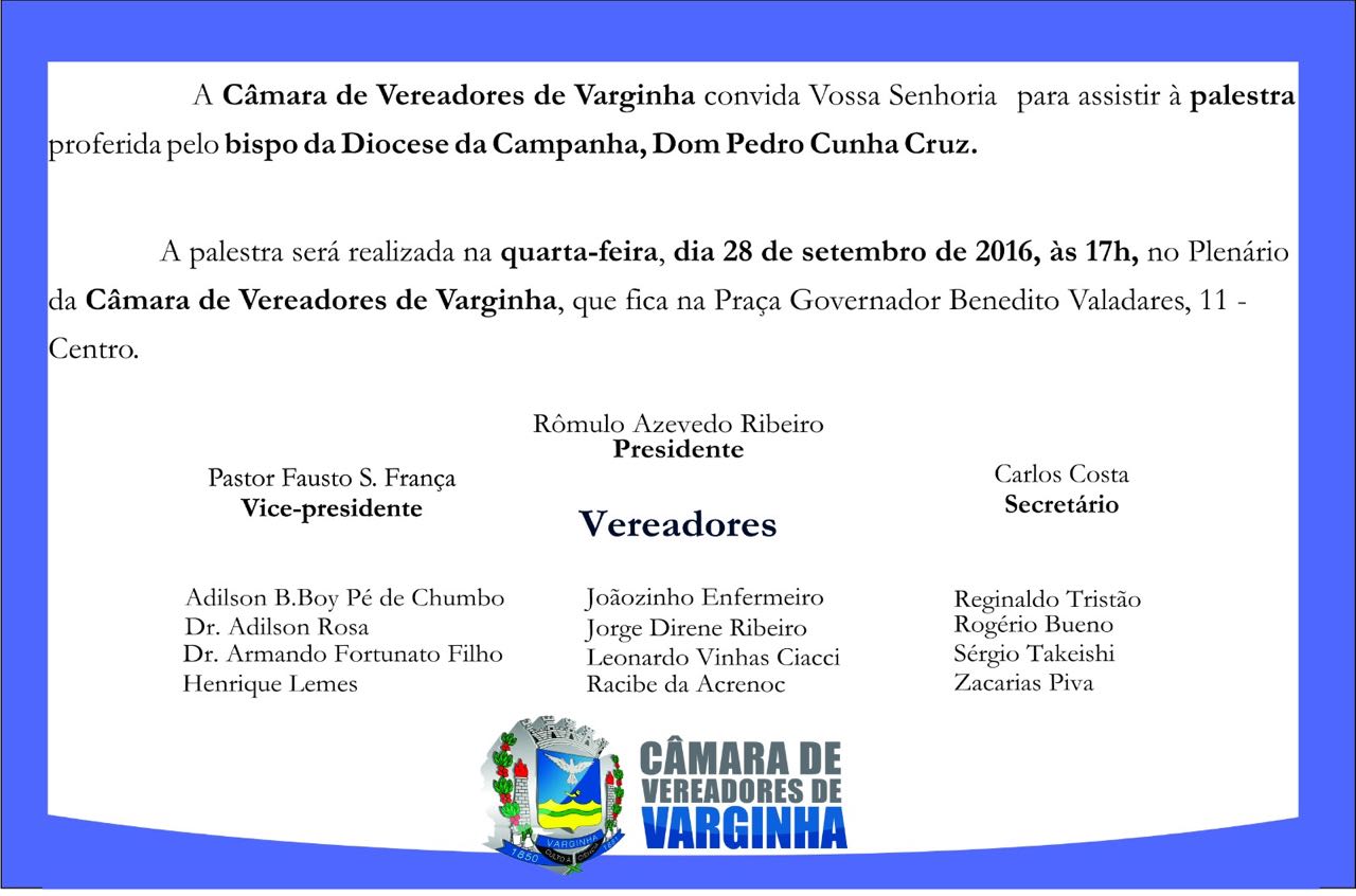 Convite palestra na Câmara de Vereadores de Varginha proferida por Dom Pedro Cunha Cruz 27 de setembro de 2016