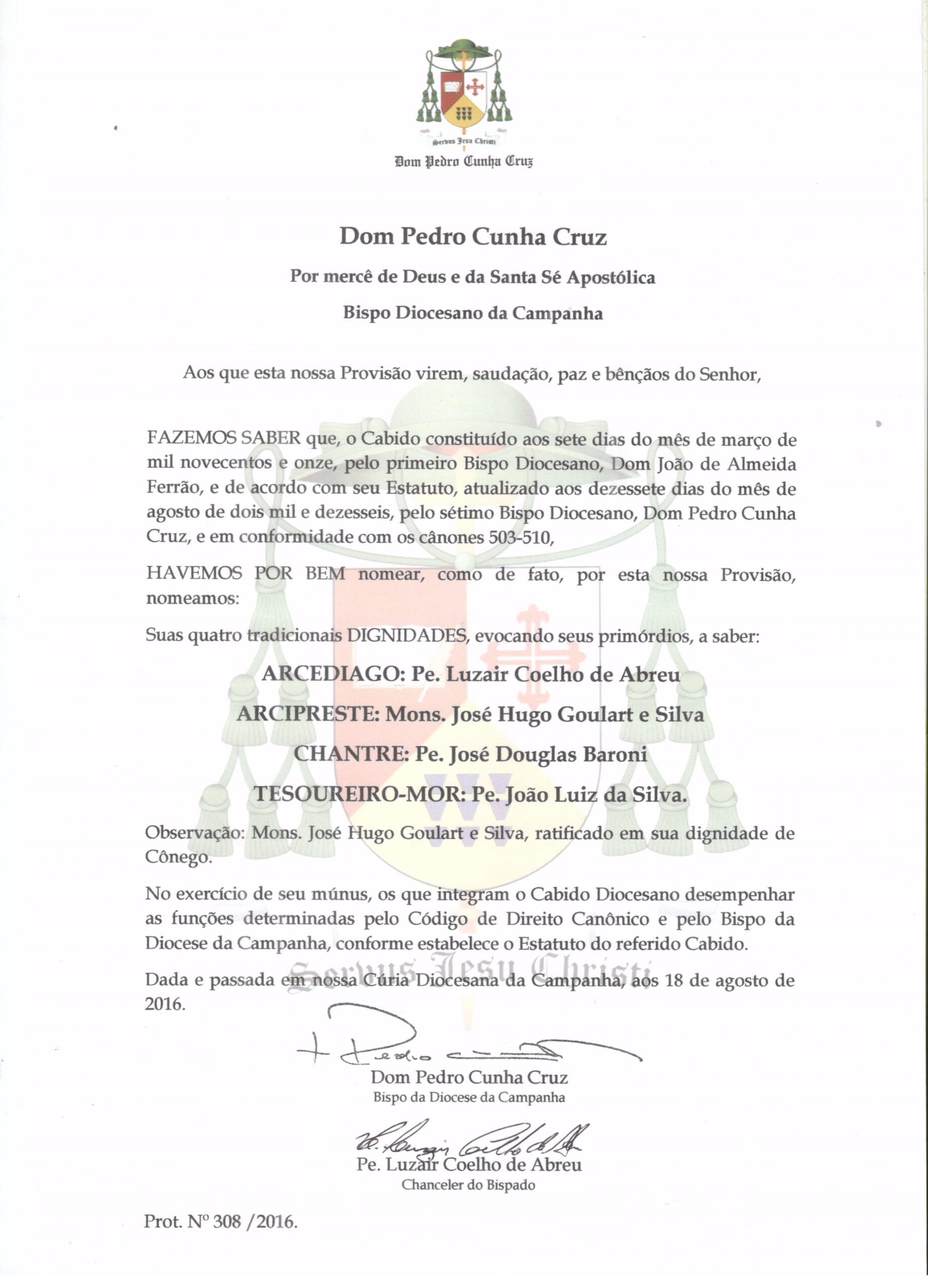 Revitalização do Cabido Diocesano Nesta festividade apostólica de São Bartolomeu, a Sé Diocesana da Campanha na pessoa de seu pastor próprio Dom Pedro 24 de agosto de 2016