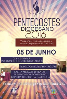 Pentecostes Diocesano 2016 Dia 05 de junho acontecerá o tradicional Pentecostes Diocesano, da diocese da Campanha-MG. Será um dia de muita oração, 25 de abril de 2016