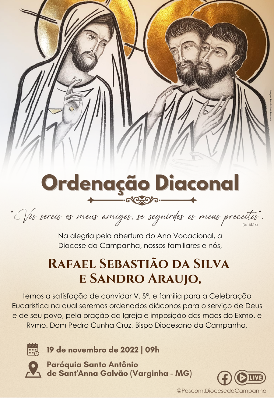CONVITE DE ORDENAÇÃO DIACONAL “Vós sereis os meus amigos, se seguirdes meus preceitos.” (Jo 15,14) Marcando a abertura do Ano Vocacional, a Diocese 4 de novembro de 2022