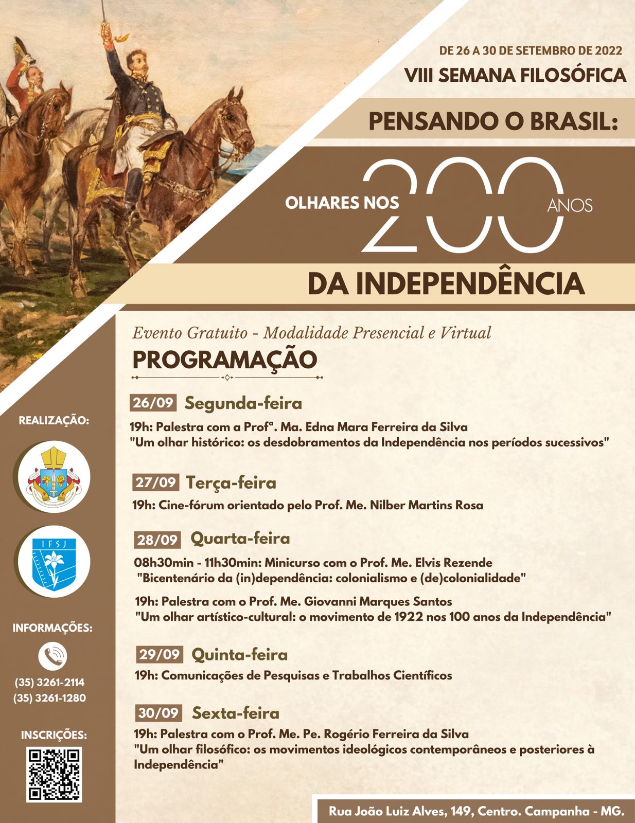 VIII SEMANA FILOSÓFICA “PENSANDO O BRASIL: OLHARES NOS 200 ANOS DA INDEPENDÊNCIA” O Instituto Filosófico São José, mantido pelo nosso Seminário Diocesano Nossa Senhora das Dores, realizará a VIII Semana Filosófica, 26 de setembro de 2022