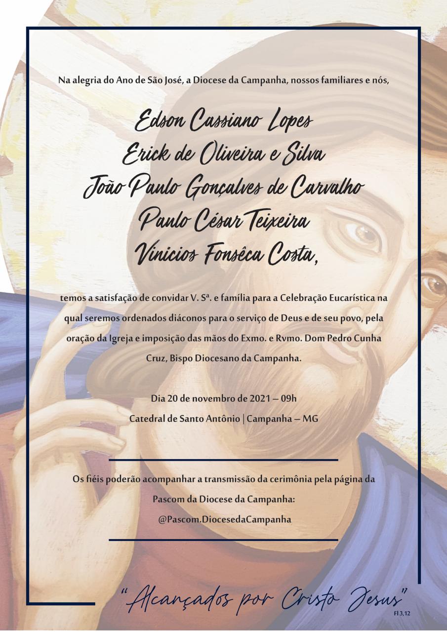 CONVITE DE ORDENAÇÃO DIACONAL Vivendo jubilosamente o Ano de São José, Patrono Universal da Igreja e das Vocações Sacerdotais, a Diocese da Campanha 13 de outubro de 2021