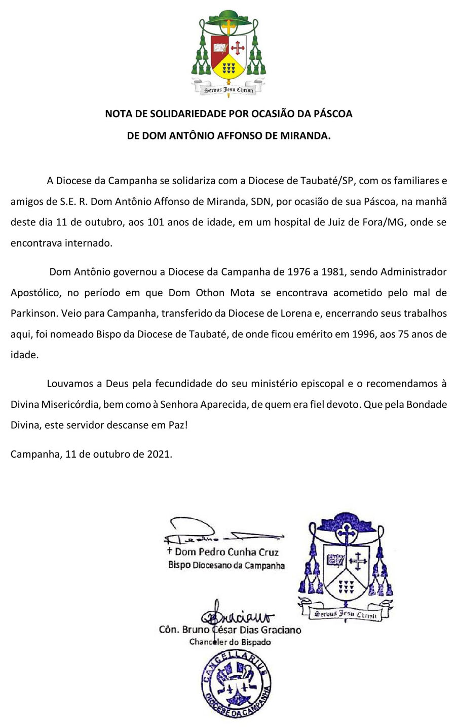 Dom Pedro emite nota de solidariedade pela morte de Dom Antônio Afonso de Miranda, aos 101 anos Na manhã de hoje, 11/10/2021, a Cúria Diocesana da Campanha emitiu nota assinada por Dom Pedro Cunha Cruz, na 11 de outubro de 2021