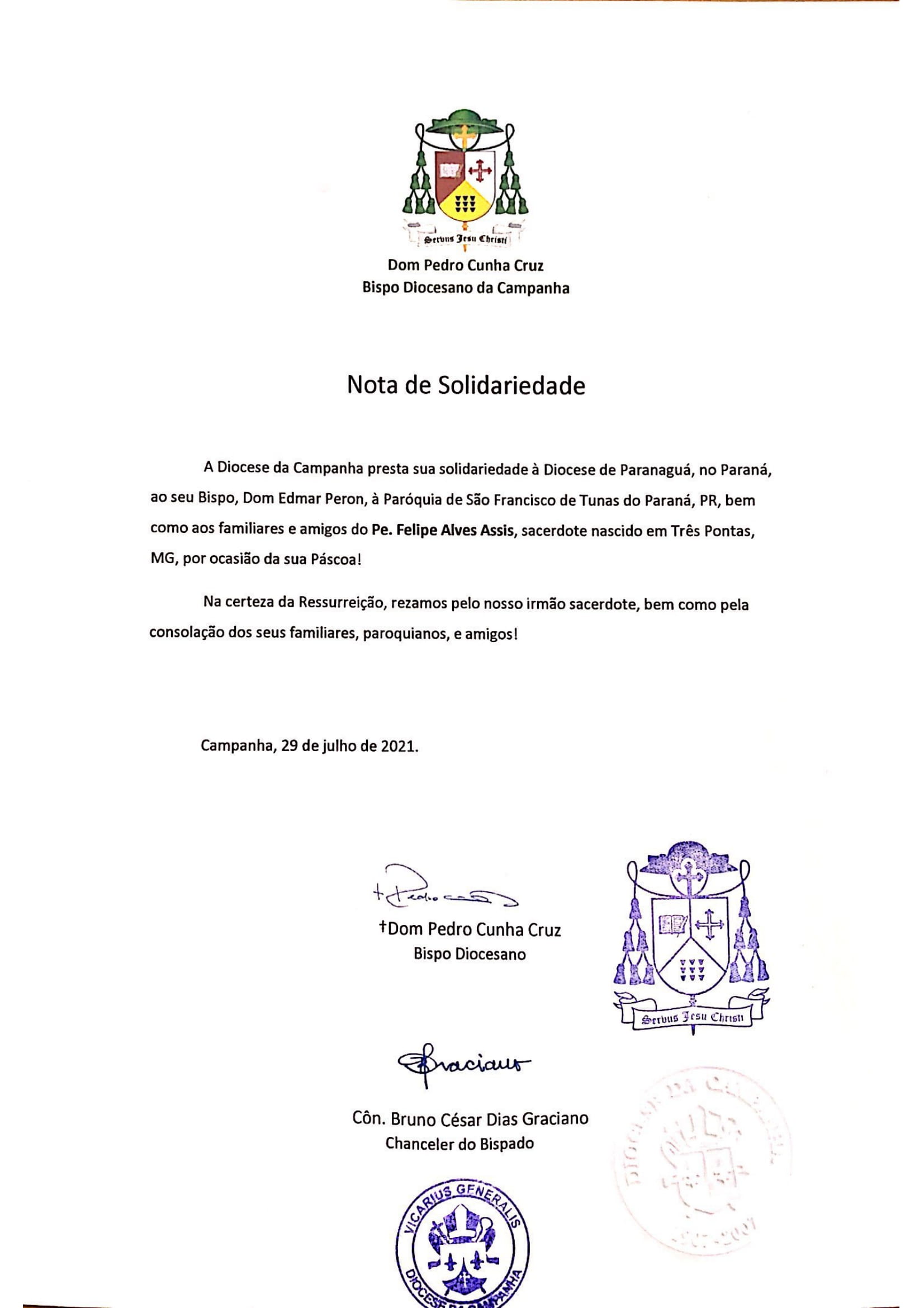 NOTA DE SOLIDARIEDADE A Diocese da Campanha, através do Coordenador Diocesano de Pastoral e dos representantes da SSVP no Conselho Diocesano de 6 de agosto de 2021