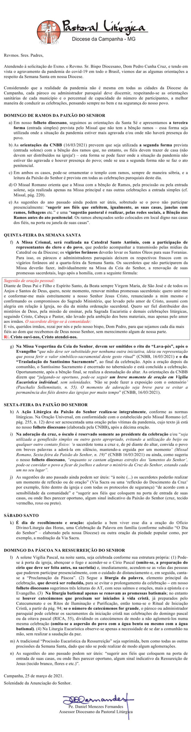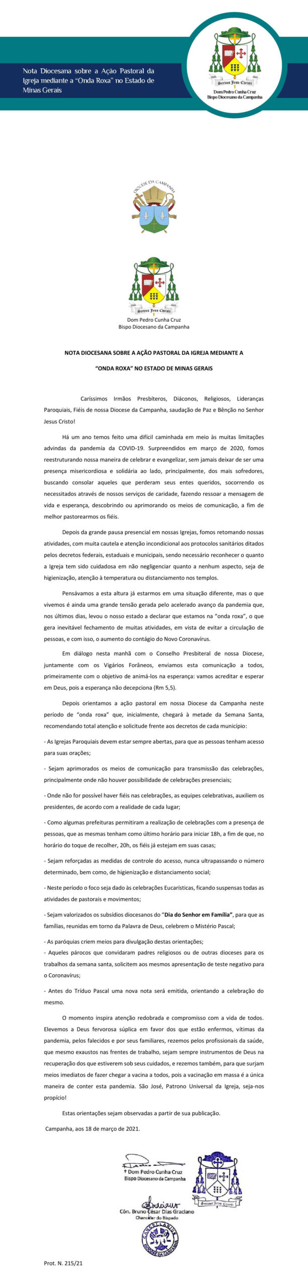 Nota Diocesana sobre a Ação Pastoral da Igreja mediante a “Onda Roxa” no Estado de Minas Gerais 19 de março de 2021