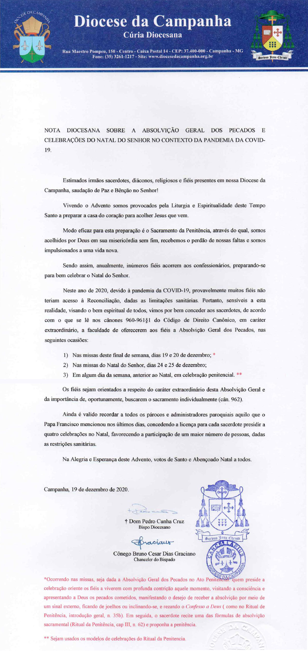 NOTA DIOCESANA SOBRE A ABSOLVIÇÃO GERAL DOS PECADOS E CELEBRAÇÕES DO NATAL DO SENHOR NO CONTEXTO DA PANDEMIA DA COVID-19 21 de dezembro de 2020