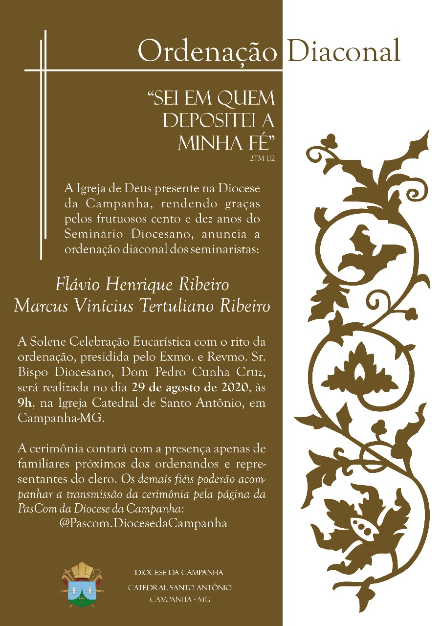 CONVITE DE ORDENAÇÃO DIACONAL Com grande alegria a Diocese da Campanha faz convite para a ordenação diaconal de Flávio Henrique Ribeiro e Marcus 12 de agosto de 2020