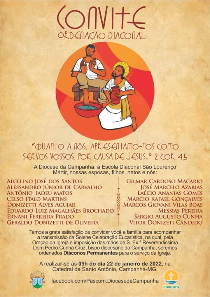 No dia 22 de janeiro, às 9h, na Catedral Santo Antônio, em Campanha-MG, serão ordenados dezesseis novos Diáconos Permanentes da primeira turma da Escola Diaconal São Lourenço Mártir.