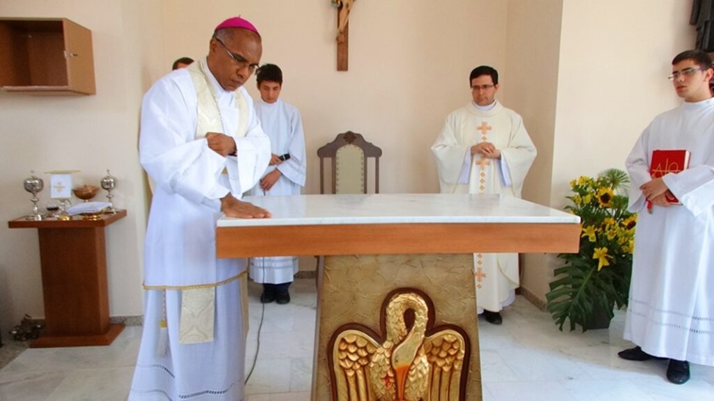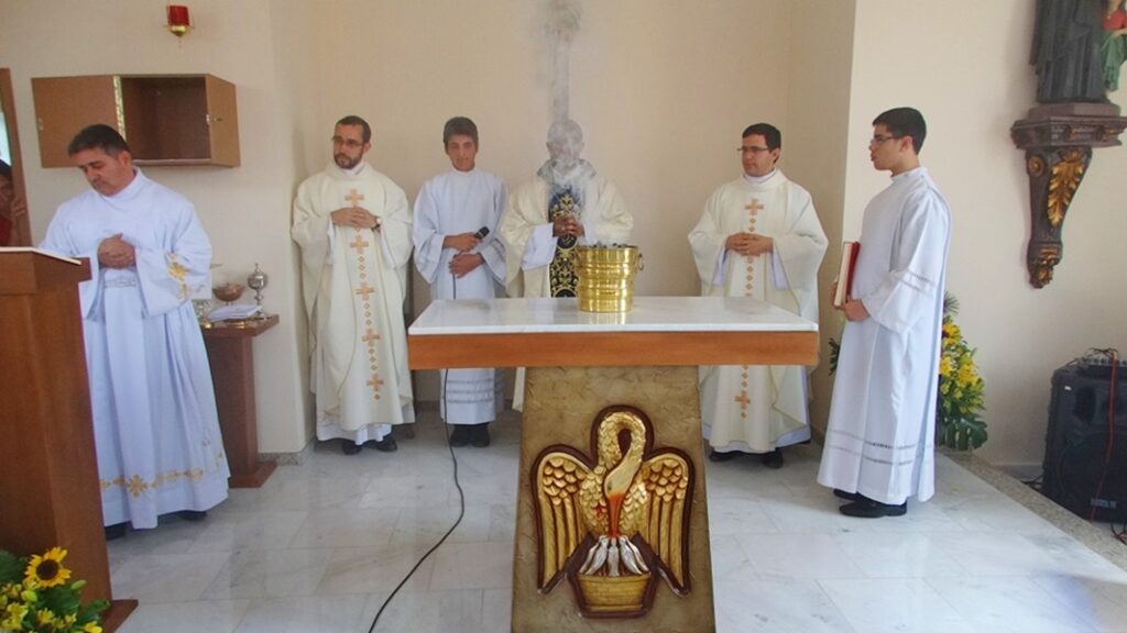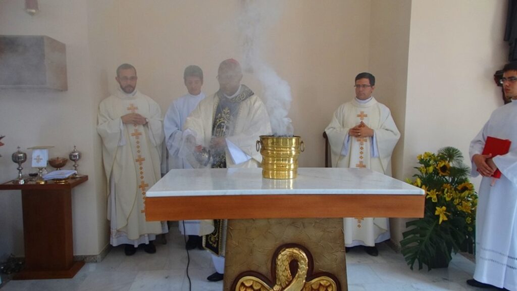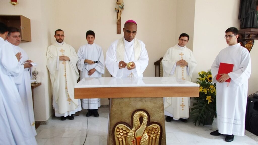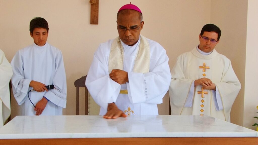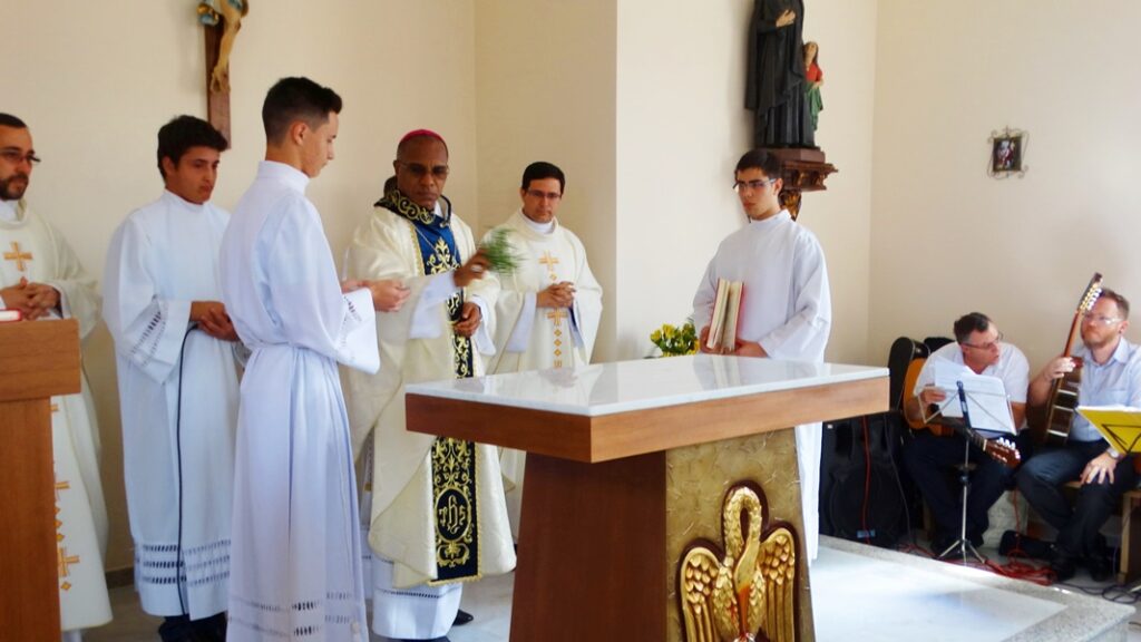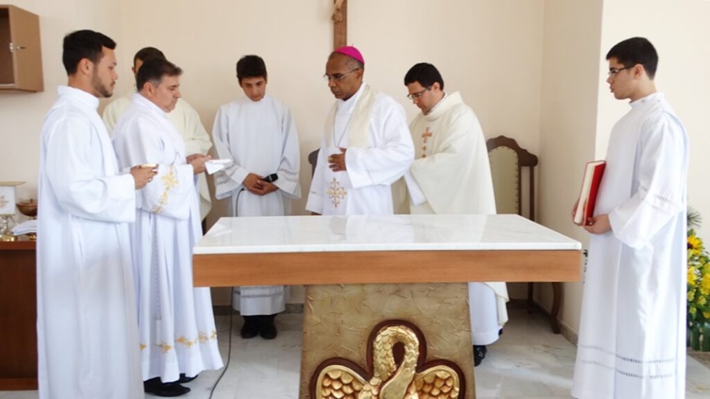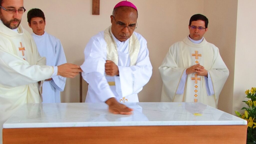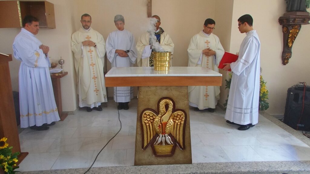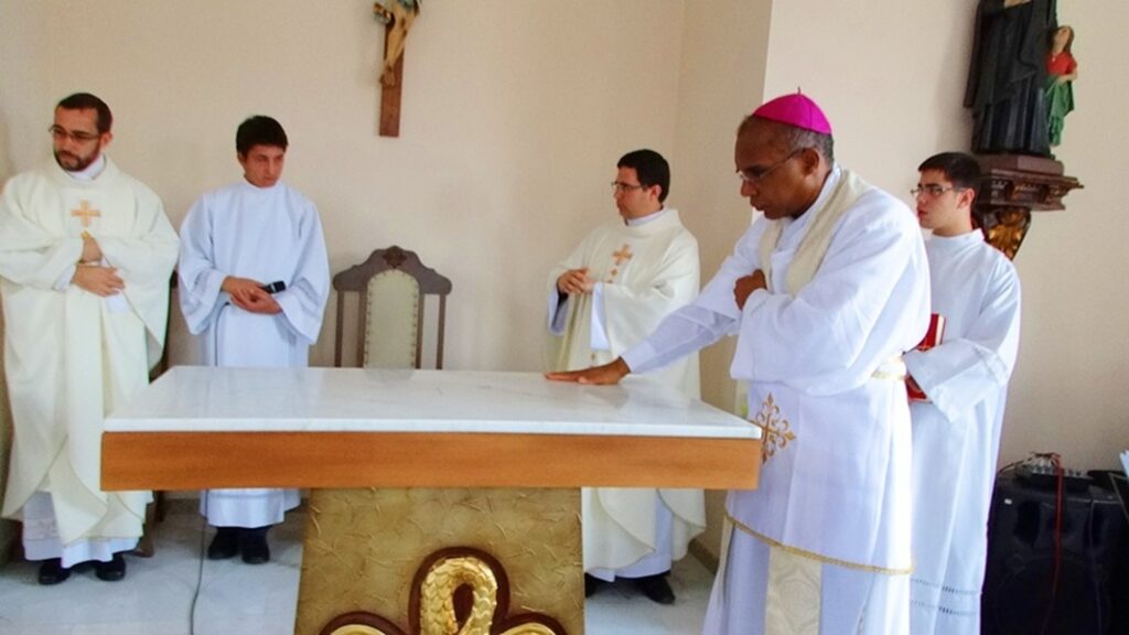 E encerrando, D. Pedro concluiu explicando a importância que o altar tem para o templo: “Nós não fizemos reverência, nem beijamos o altar, na entrada, mas uma vez ungido, esse altar que vai receber as espécies do pão e do vinho que vão ser consagradas o corpo e sangue do senhor Jesus. Sempre que nós passarmos aqui, nós faremos uma reverência: um sinal de respeito pelo lugar mais sagrado desse templo que é o altar. Eu sempre digo: quando tem um sacrário na igreja, o lugar mais sagrado é o altar. O sacrário é o local que vai recolher as espécies eucarísticas do Cristo, a presença eucarística do pão, mas o que acontece aqui. Nós não consagramos as hóstias dentro do sacrário; o padre ou o bispo não abre a portinha do sacrário e consagra ali. Ele consagra sobre o altar. “