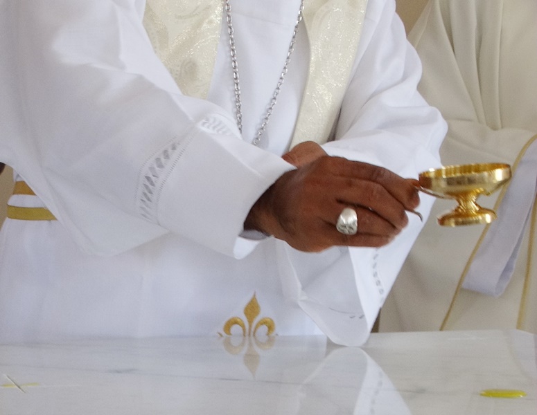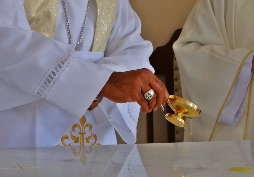 Dando sequência ao rito de dedicação, o bispo motivou a Assembleia a invocar a intercessão dos santos para a unção que será realizada. Terminada a ladainha, procedeu-se a unção do altar com o óleo do santo crisma. Pela unção, o altar torna-se símbolo do Cristo entre nós. O santo crisma é colocado ao centro em cada uma das pontas do altar e, posteriormente, espalhado por toda a superfície.