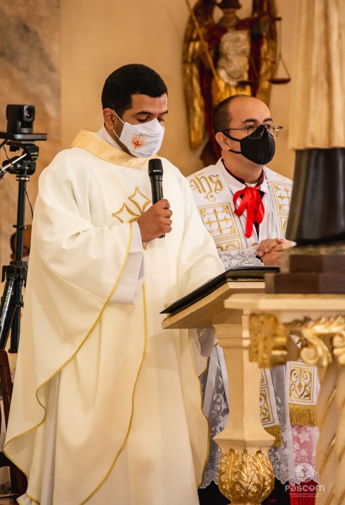 Ao final da celebração, pelos ordenados, fez o agradecimento o Pe. Marcus Vinícius Tertuliano Ribeiro, que teve a possiblidade de agradecer aos senhores bispos presentes, Dom Diamantino, que acreditou em suas vocações desde o início e D. Pedro, que sempre os estimulou no crescimento formativo. Logo no início de seu discurso de agradecimento, o neossacerdote resume este momento, citando o salmista “Que poderei retribuir ao Senhor Deus por tudo aquilo que ele fez em meu favor”. Uma palavra especial foi dirigida aos padres formadores que os acompanharam durante a caminhada vocacional: “Os nossos formadores foram instrumentos de Deus em nossas vidas. Deixamo-nos ser modelados; por vezes demos trabalhos, isso é fato! Não é fácil um processo de desconstrução e reconstrução. Mas no itinerário formativo isso é necessário! […] Se chegamos até aqui é porque acreditamos em nossos formadores e no projeto formativo de nossa diocese; e eles acreditaram em nós!”. Ao final, ressaltou que os tempos não são fáceis pois a pandemia apontou muitas sombras na sociedade, mas eles são chamados a serem luzeiros para dissipar as trevas e homens da esperança.