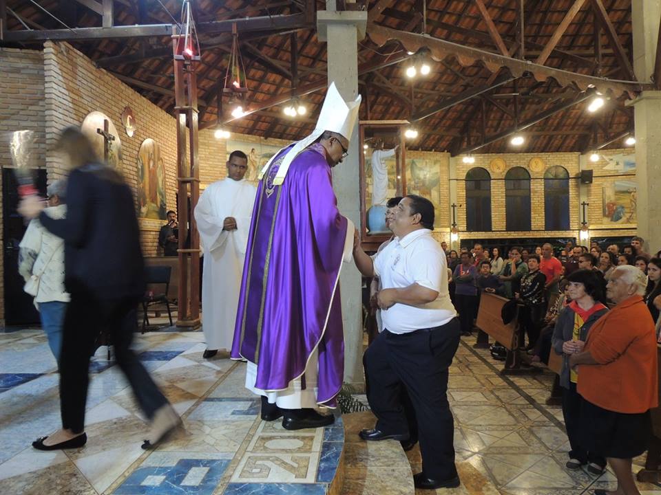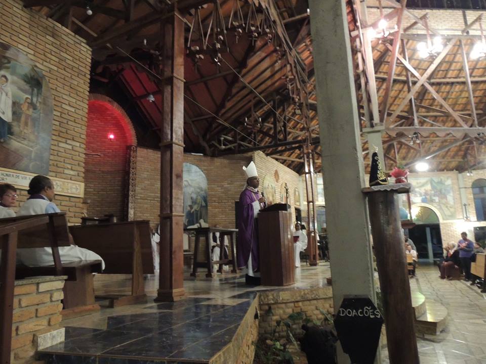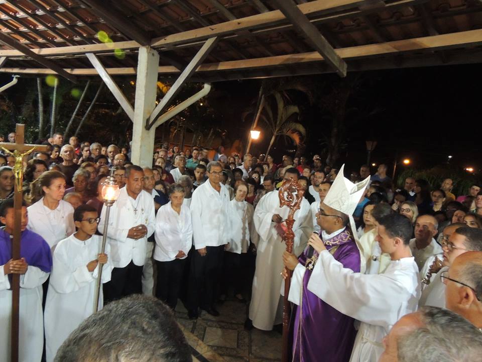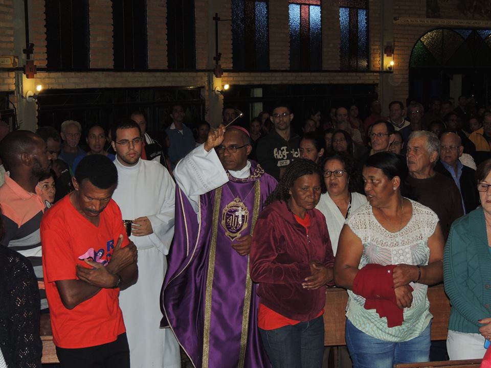 Dom Pedro, em sua acolhida aos fiéis, iniciou a celebração no adro do Santuário, com todas as luzes da igreja apagadas, o Sr. Bispo abriu a porta frontal do Santuário, por onde adentrou a equipe litúrgica, em seguida, aspergiu toda assembléia e paredes da igreja com água benta fazendo memória ao nosso batismo.