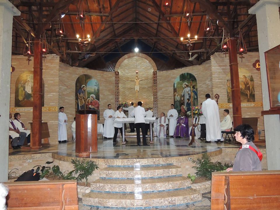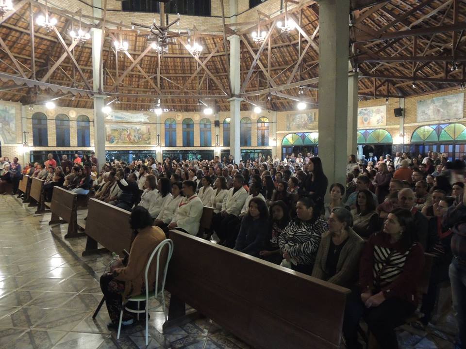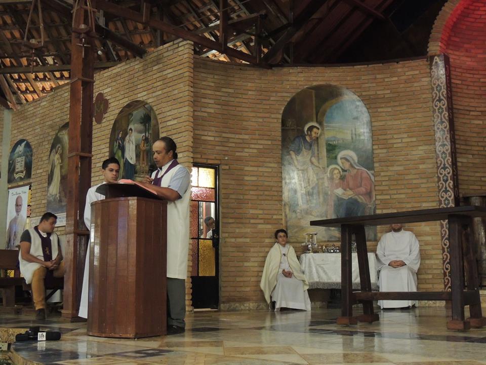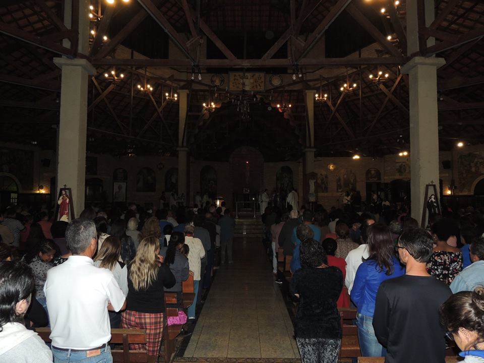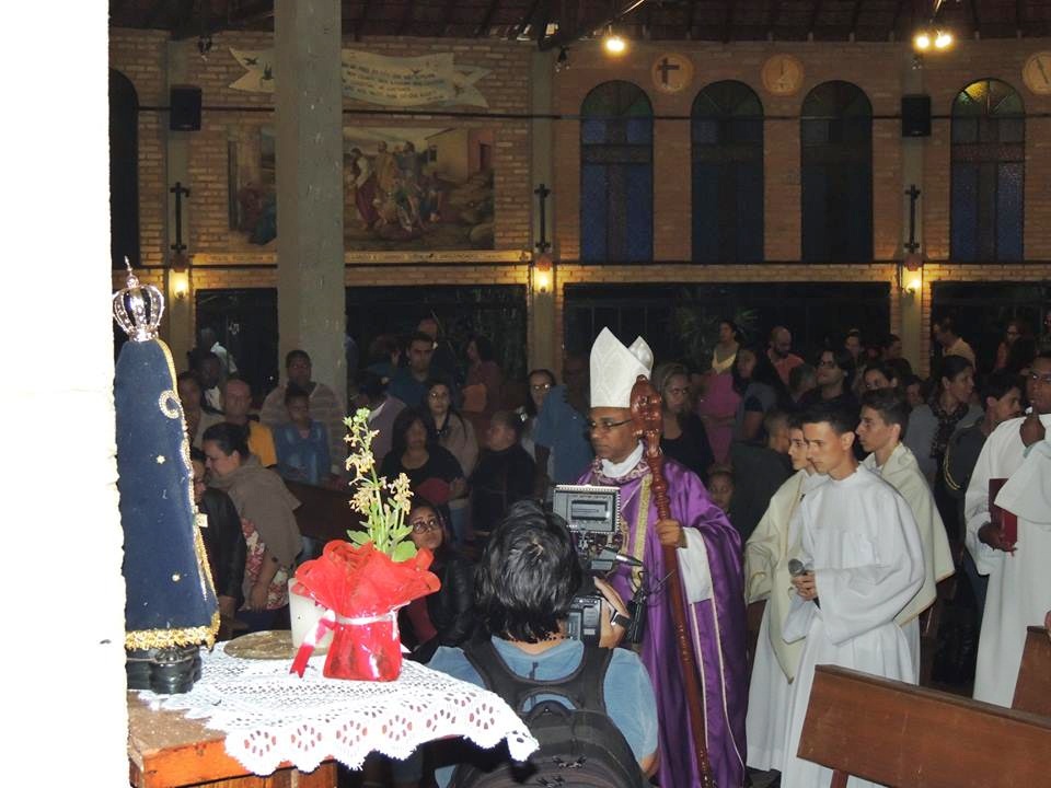 Dom Pedro, em sua acolhida aos fiéis, iniciou a celebração no adro do Santuário, com todas as luzes da igreja apagadas, o Sr. Bispo abriu a porta frontal do Santuário, por onde adentrou a equipe litúrgica, em seguida, aspergiu toda assembléia e paredes da igreja com água benta fazendo memória ao nosso batismo.