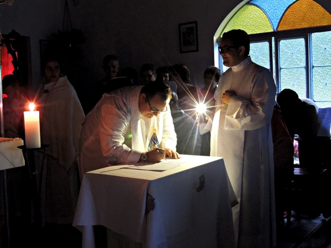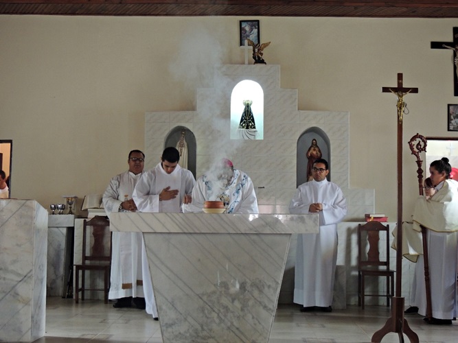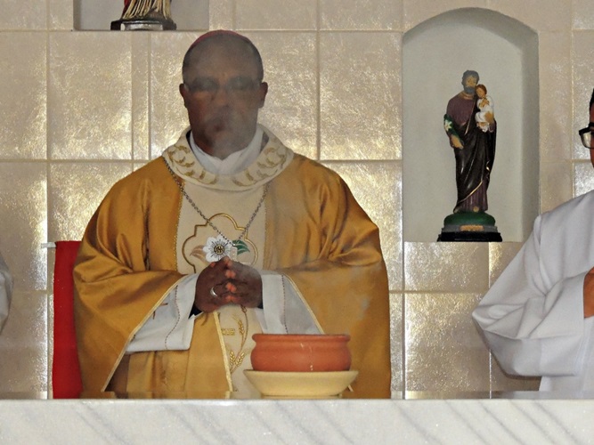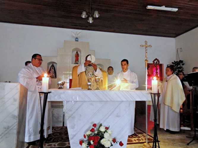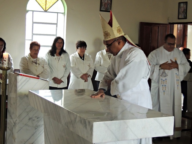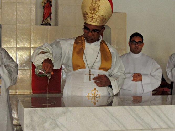 O Exmo. e Revmo. Dom Pedro Cunha Cruz, nos brindou com uma belíssima catequese, levando-nos a uma compreensão de que o rito de dedicação do altar, nos lembra aquilo que somos nós, Igreja. Em sua catequese, Dom Pedro nos esclareceu que o altar simboliza uma grande festa, em que Cristo se dá como alimento para saciar a fome daqueles que O buscam; disse-nos ainda: com a dedicação dos altares que haja um aumento da piedade eucarística, para que os fiéis creiam na Missa como renovação e atualização do sacrifício da Cruz, pela qual se tornam presentes, de modo real e substancial, o Corpo e o Sangue, ainda que sob a aparência de pão e de vinho; fomentar a frutuosa, plena, consciente e ativa participação de todos os batizados na Santa Missa, na Exposição do Santíssimo, na celebração dos sacramentos, e nas demais cerimônias litúrgicas.