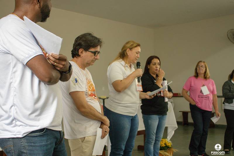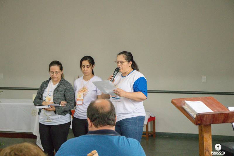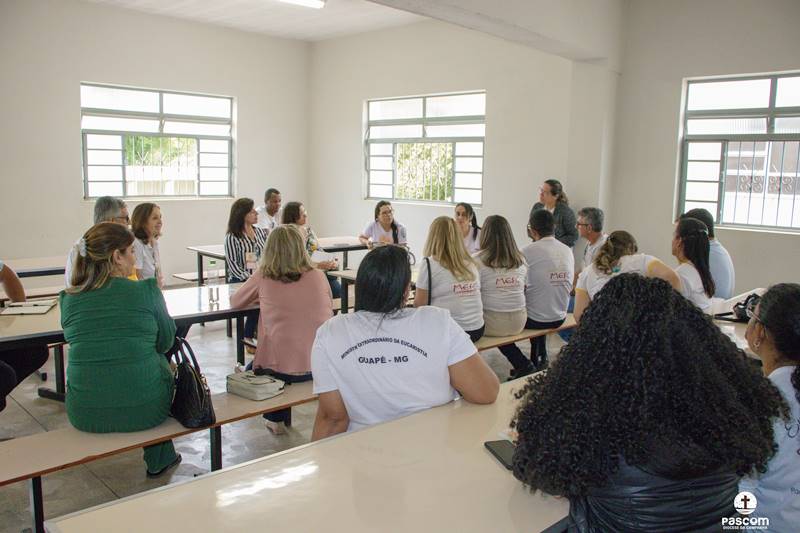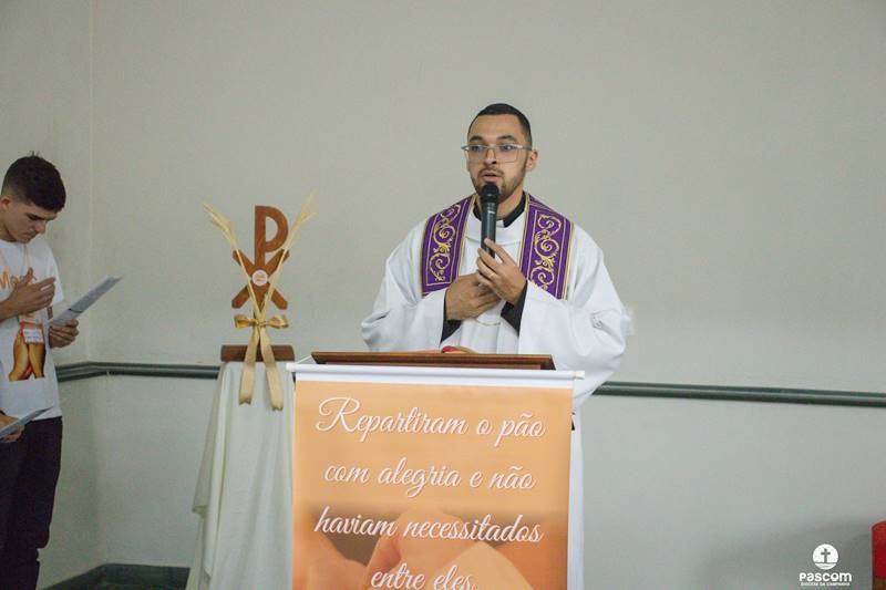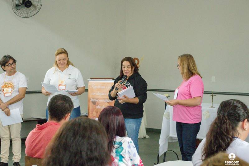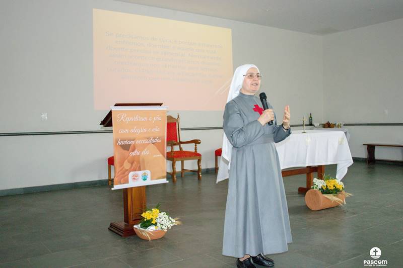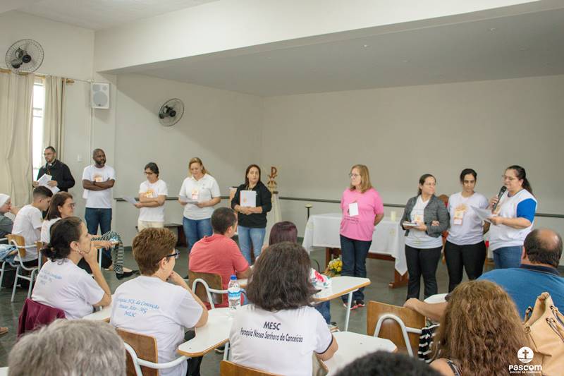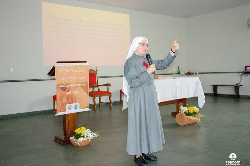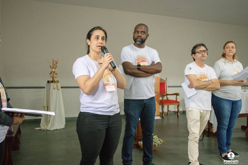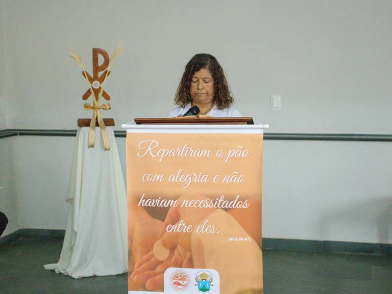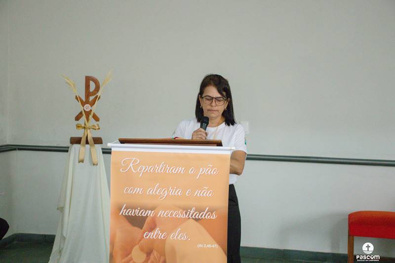 Dando continuidade, a Irmã Francisca (Camiliana) da Paróquia Cruzília, descreveu sobre o Tema “Pão em todas as mesas” e o lema “Repartiam o pão com alegria, não havia necessitados entre eles”, conteúdo esclarecedor e muito importante para o Ministério Extraordinário da Sagrada Comunhão. Após a palestra os representantes se reuniram em grupos, por forania e discutiram algumas questões propostas pela Equipe Diocesana. Em seguida foi celebrada a Santa Missa, presidida pelo Padre Flávio.