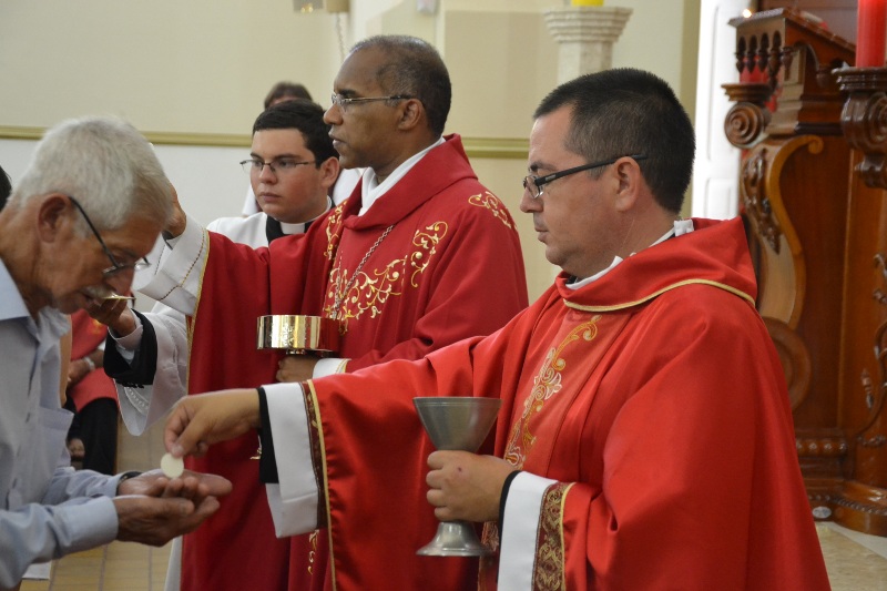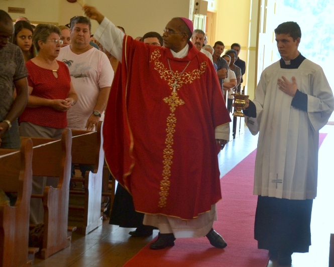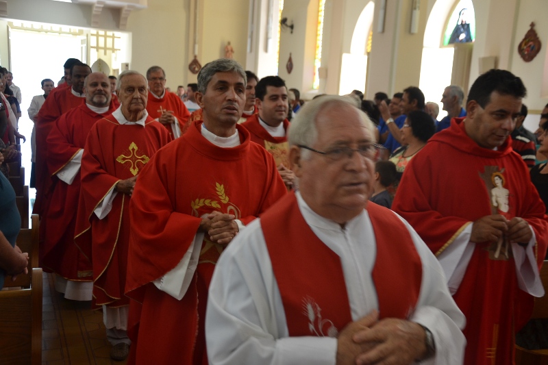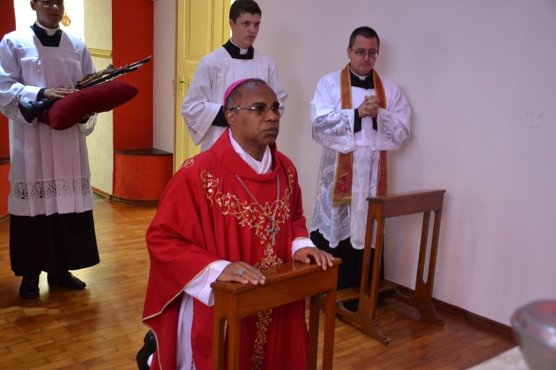 Antes da procissão de entrada para a Solene Celebração, na memória do Martírio do Diácono Santo Estêvão, Dom Pedro fêz a entrada canônica, reverenciando o Crucificado, aspergindo o povo de Deus e se colocando em oração diante do Sacrário, na Capela do Santíssimo. A seguir, precedido dos padres das paróquias de Conceição das Pedras, São José do Alegre, Pedralva, Cristina, Carmos de Minas, Dom Viçoso, Pouso Alto, São Sebastião do Rio Verde, Virgínia, Santana do Capivari, Itamonte, Itanhandu e a paróquia anfitriã: Passa Quatro, Dom Pedro deu início a Celebração Eucarística, pedindo que cada sacerdote se apresentasse. Ladearam Dom Pedro no presbitério o Pe. Carlos Ribeiro Natali, pároco de Passa Quatro e o Padre José Paterno, Pároco de Pouso Alto e Vigário Forâneo. Mais uma vez o coral paroquial Cônego Olavo animou com muita beleza e harmonia os cânticos durante a celebração.