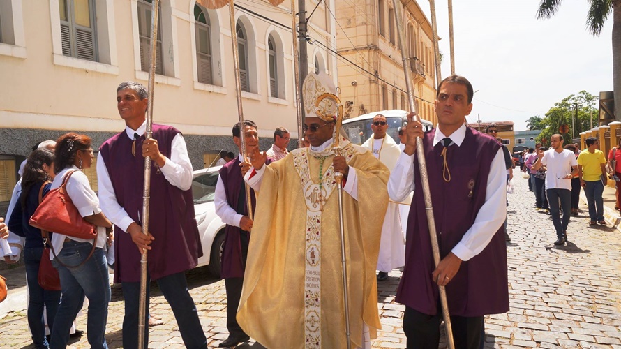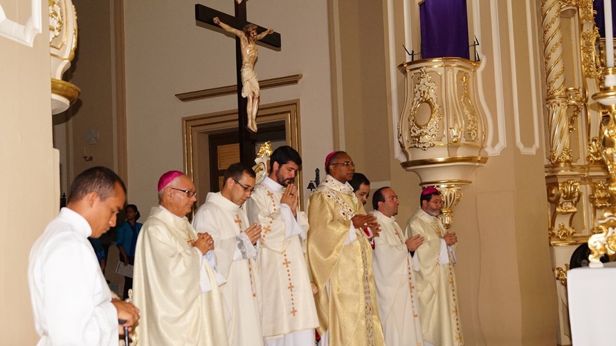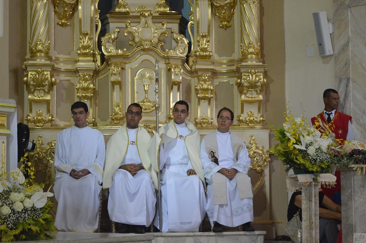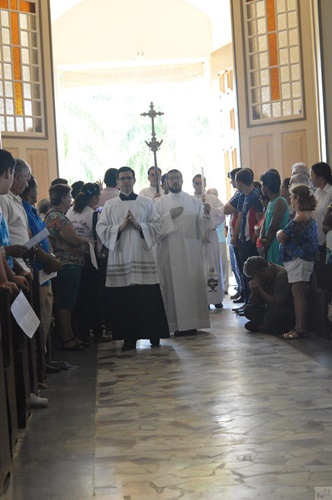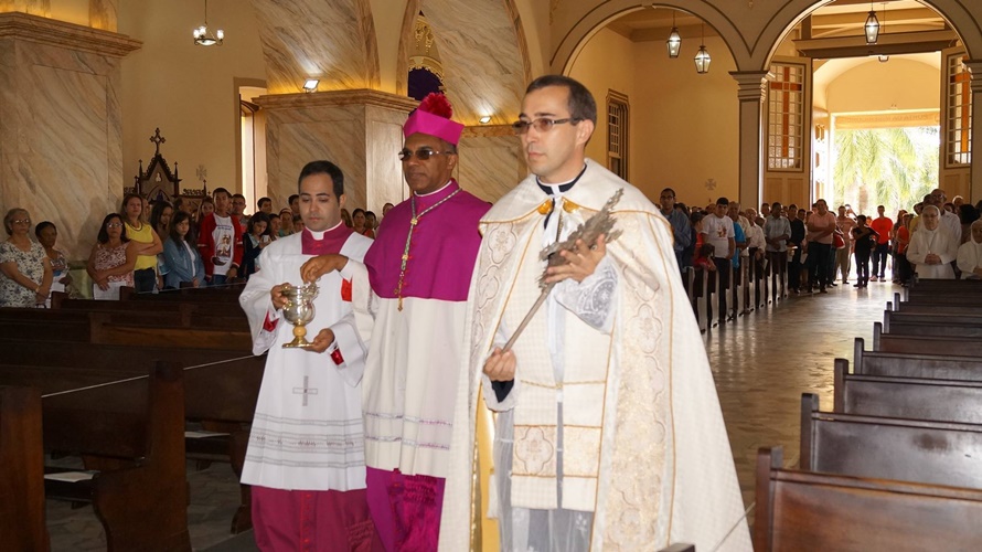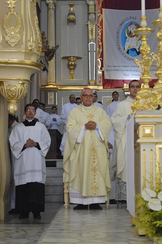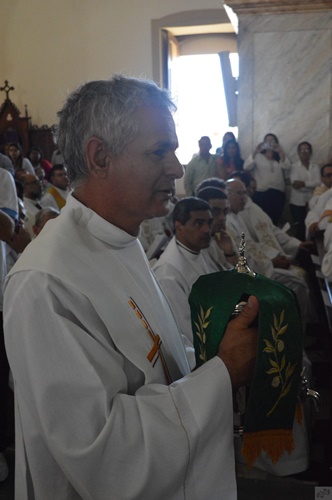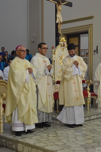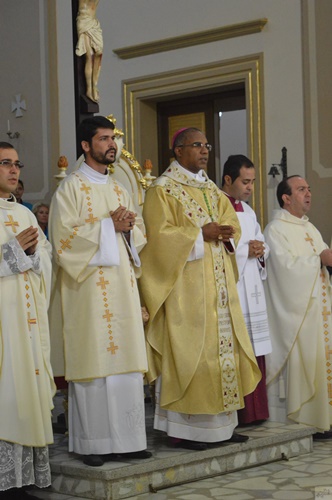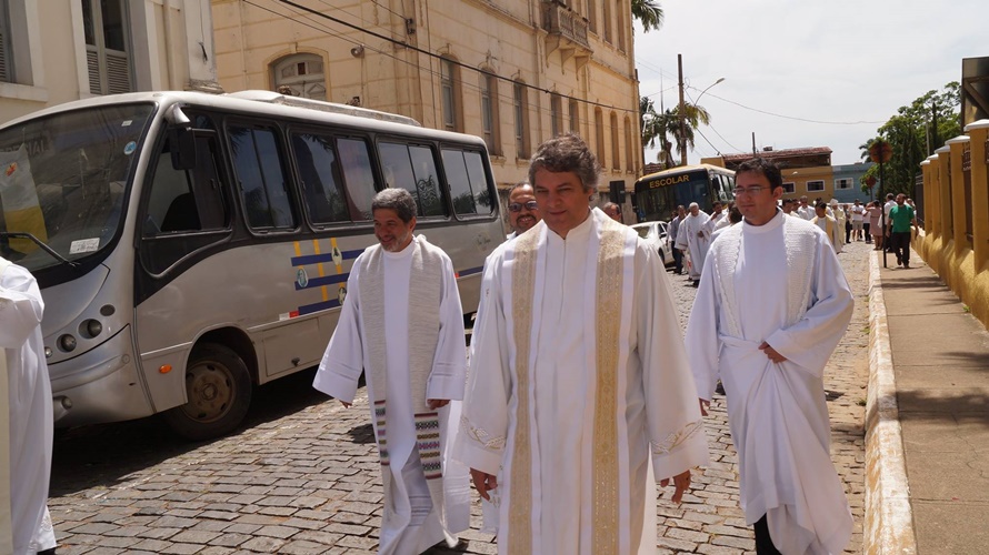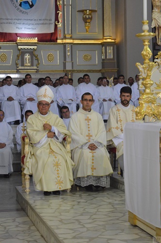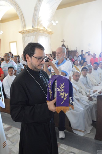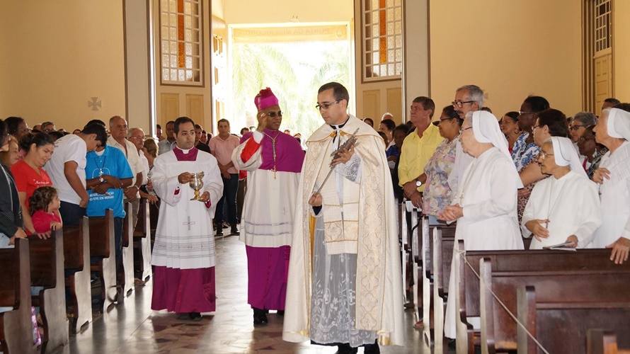 Iniciando sua homilia, d. Pedro saudou D. Diamantino Prata de Carvalho ofm, bispo emérito de nossa diocese e D. Joércio Gonçalves Pereira CCsR, emérito da prelazia de Coari/AM, residente na diocese.
