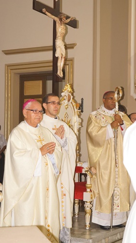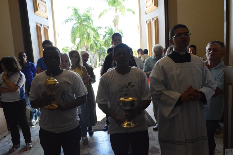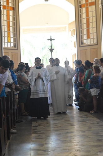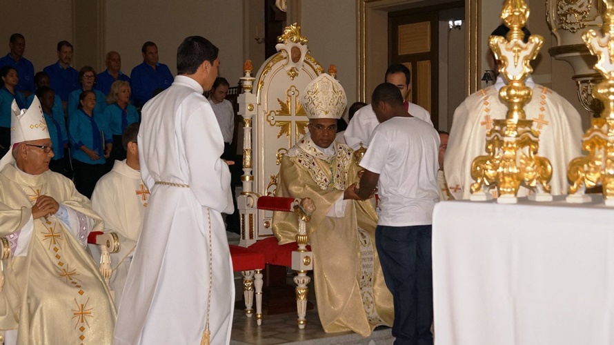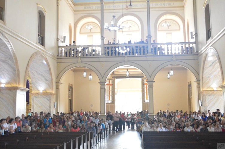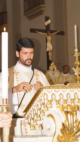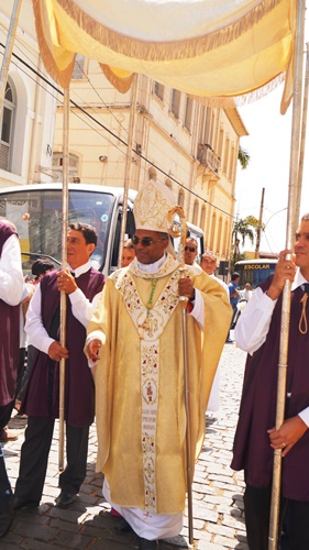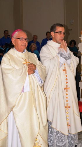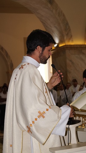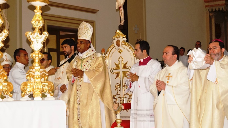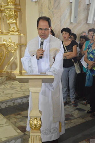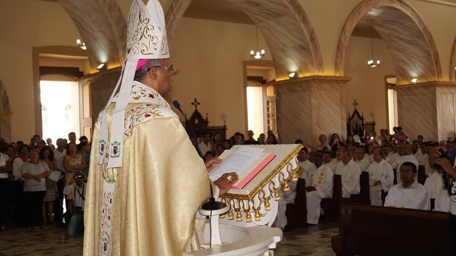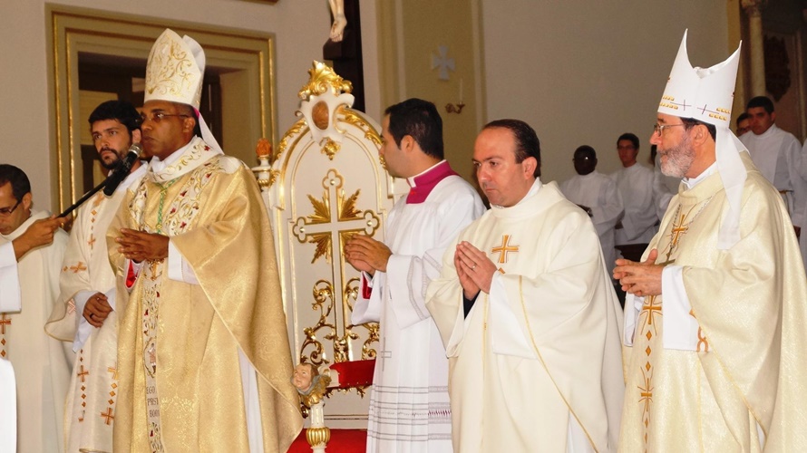 Iniciando sua homilia, d. Pedro saudou D. Diamantino Prata de Carvalho ofm, bispo emérito de nossa diocese e D. Joércio Gonçalves Pereira CCsR, emérito da prelazia de Coari/AM, residente na diocese.