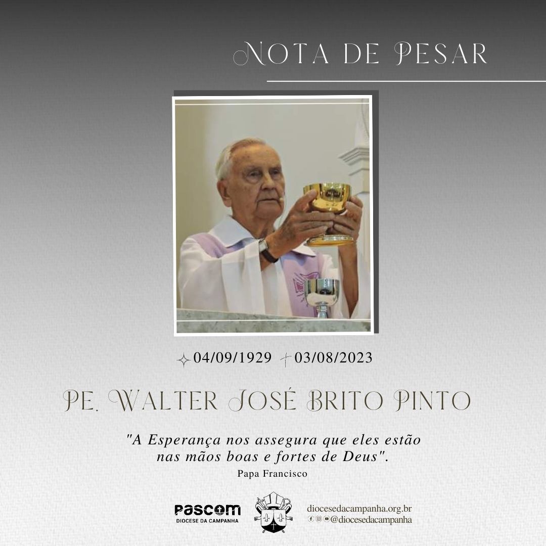 Na madrugada deste dia 03 de agosto, Deus chamou a Si o Revmo. Sr. Pe. Walter José Brito Pinto, SJ, que durante muitos anos serviu à nossa Diocese da Campanha, com vanguarda no trabalho pastoral e grande zelo quanto às familias, especialmente dedicado à Pastoral Familiar e às Equipes de Nossa Senhora, grande incentivador da formação e protagonismo dos leigos. Passou pela Paróquia Nossa Senhora Aparecida, em Campo do Meio; São José, em Itamonte; Sant’Ana e São José, em Varginha e Nossa Senhora da Conceição, em Virgínia, onde residia.