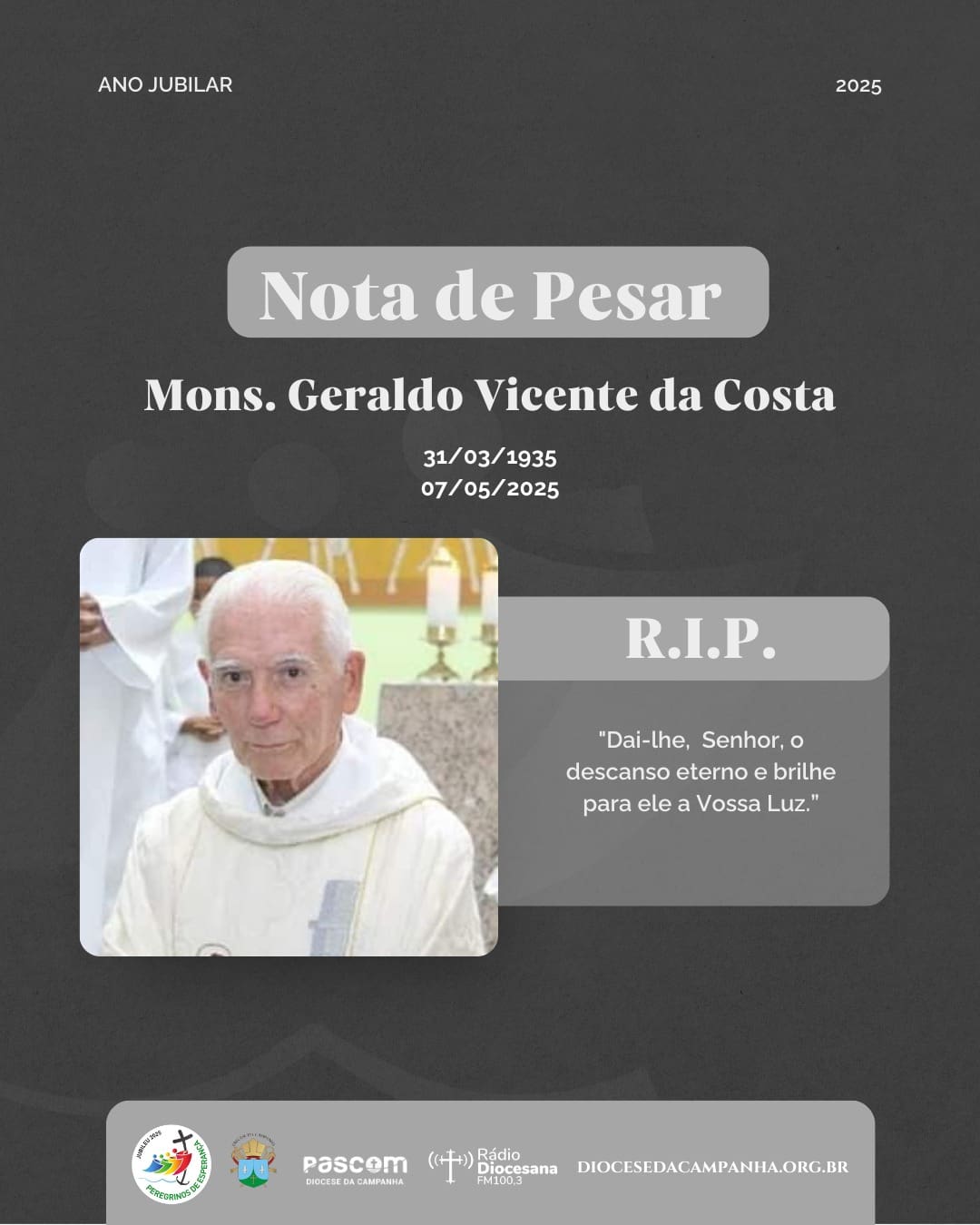 Após um período de enfermidade, partiu para o descanso eterno aquele que, ao longo de 66 anos de sacerdócio, não descansou no cuidado do povo de Deus. Homem fiel à Igreja e atento aos mais necessitados, Monsenhor Geraldo foi notável por sua caridade com os pobres e com as crianças, testemunhando a compaixão de Cristo em cada gesto de sua vida pastoral.