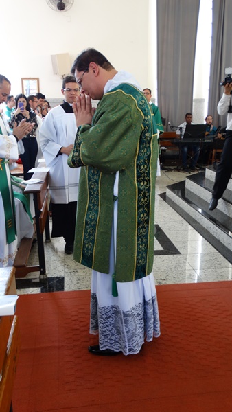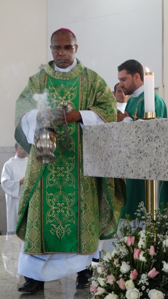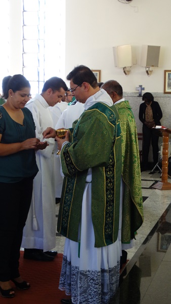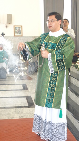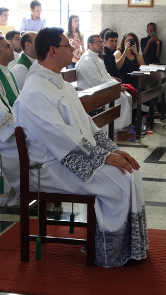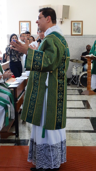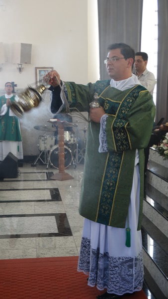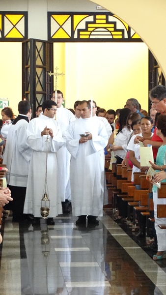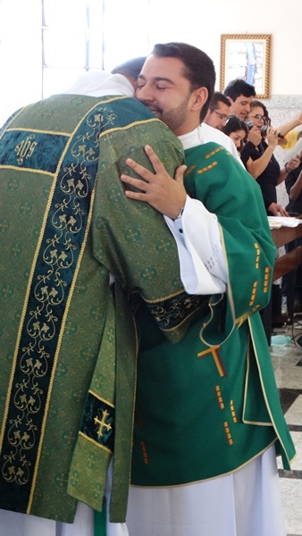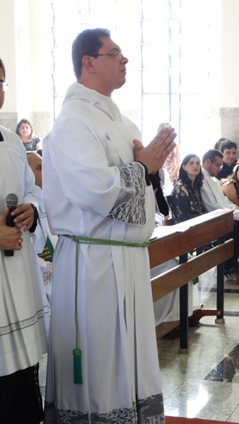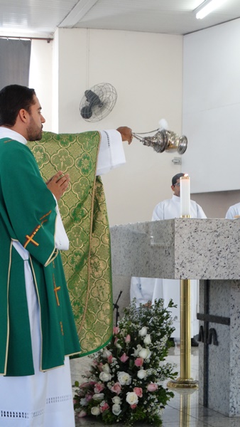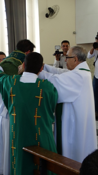 Cheios de alegria, a comunidade reunida para a celebração da Páscoa semanal, juntamente com seus familiares, amigos, presbíteros da nossa Diocese e Legionários de Cristo, Diáconos e nossos Seminaristas elevavam a Deus o Sacrifício Eucarístico no qual o Diácono Cleiton entregou sua vida no Altar do Senhor trazendo como lema de ordenação “Se alguém que me quer servir, siga-me; e, onde eu estiver, estará também o meu servo” (Jo17,26).