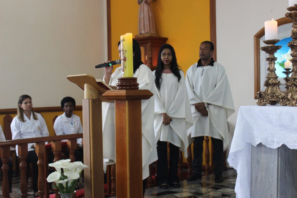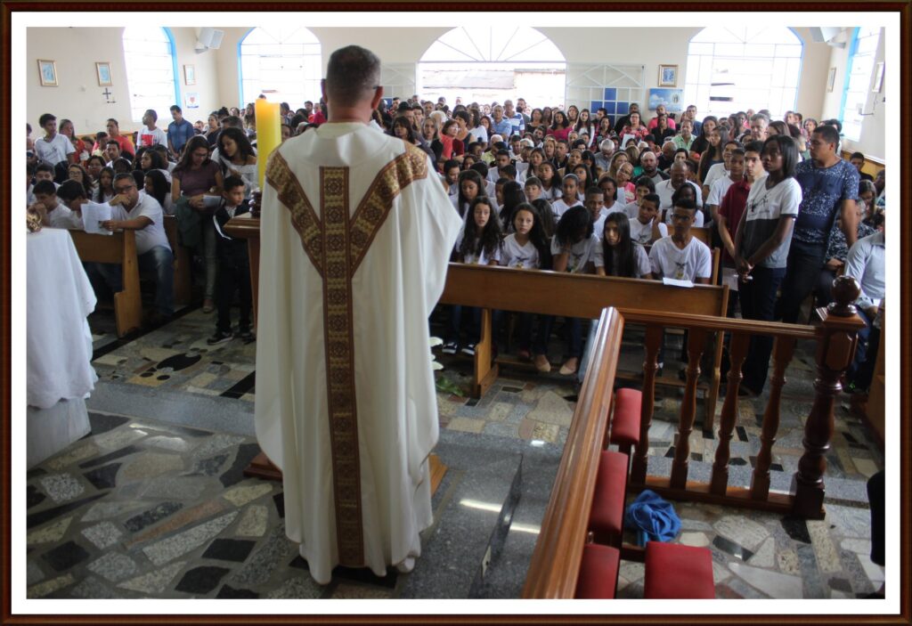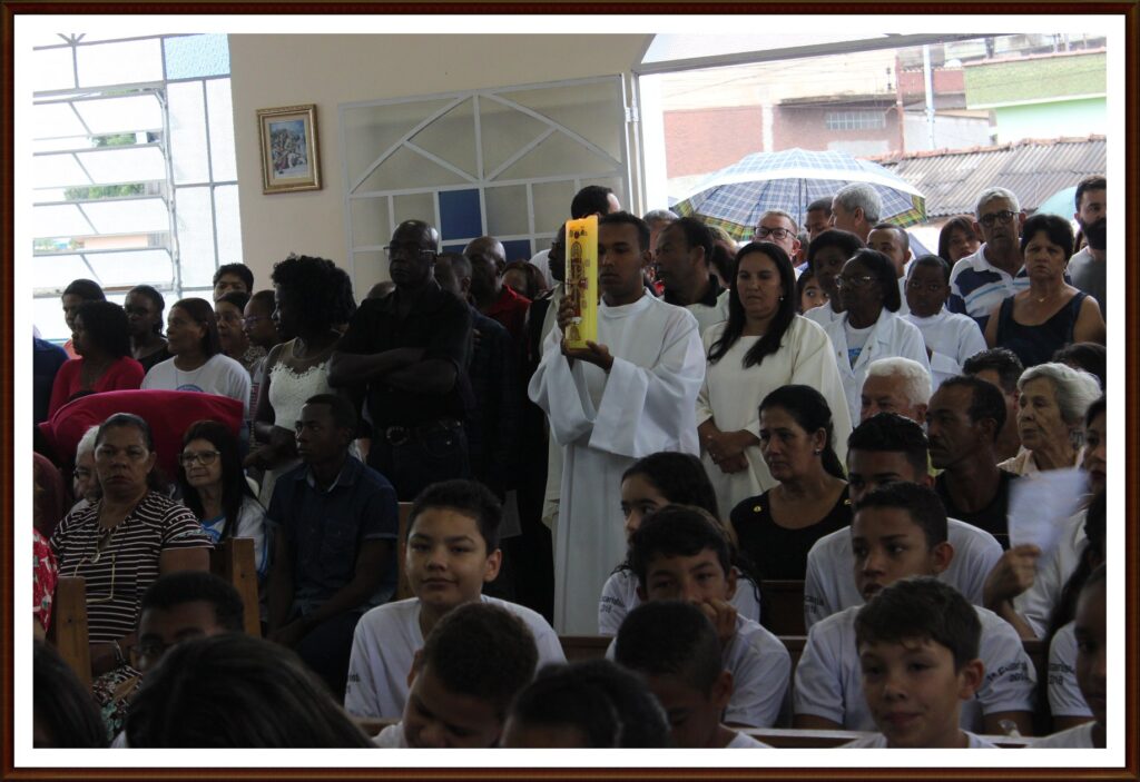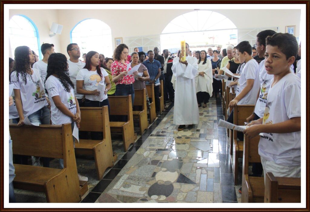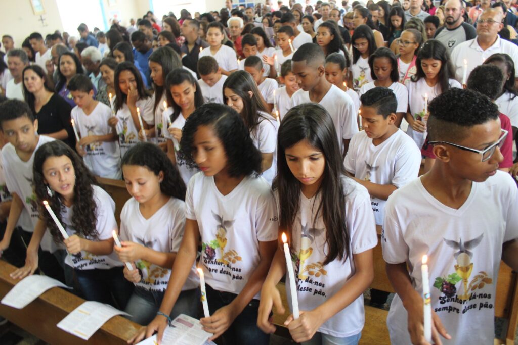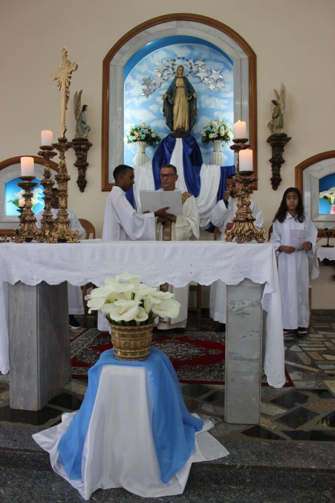 Também de modo especial durante a Festa foi celebrada a Primeira Comunhão de nossos catequizandos, um momento muito especial na vida de todos eles em que aos pés de Nossa Senhora fizeram a oferta de flores pedindo e agradecendo pela intercessão da Virgem.