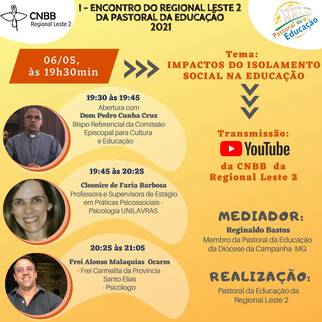 Voltado aos educadores, acontecerá o 1° Encontro da Pastoral da Educação realizado pela Regional Leste 2, no dia 06 de maio, quinta-feira, às 19h30 pelo YouTube. Pedimos que repassem aos diretores para que eles possam aproveitar esta LIVE em suas escolas como cumprimento de Reuniões Pedagógicas ou Módulo II.