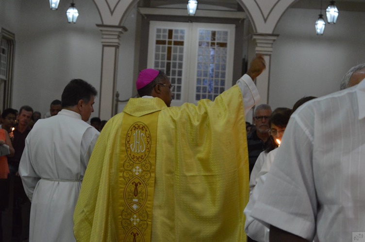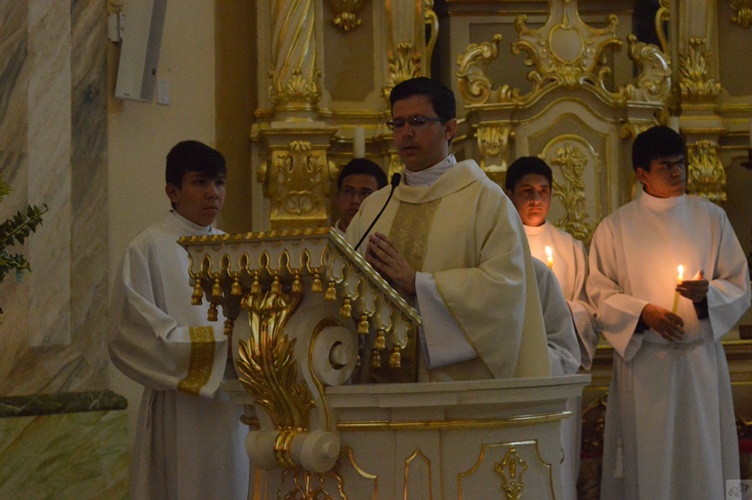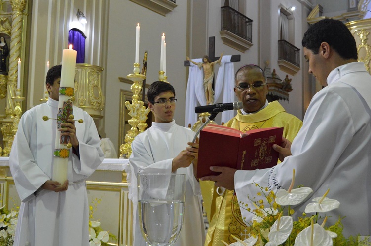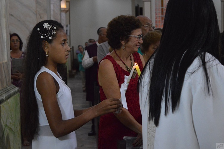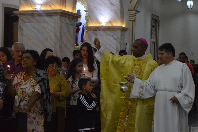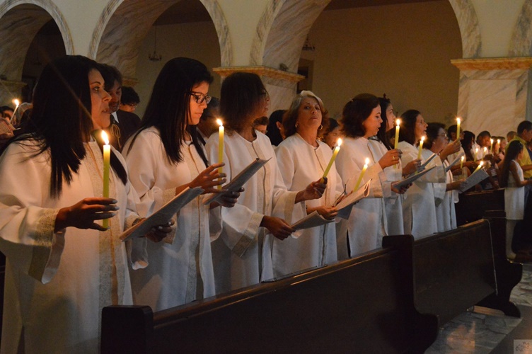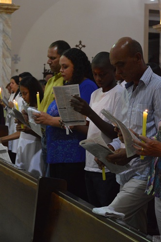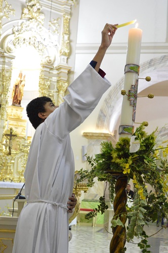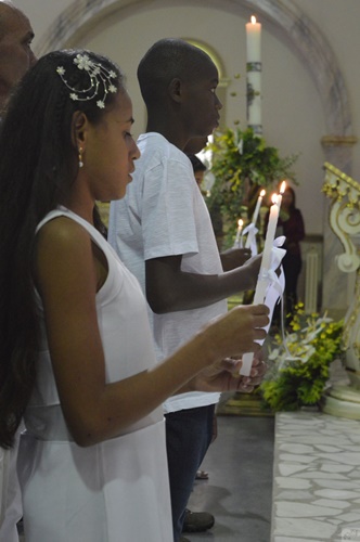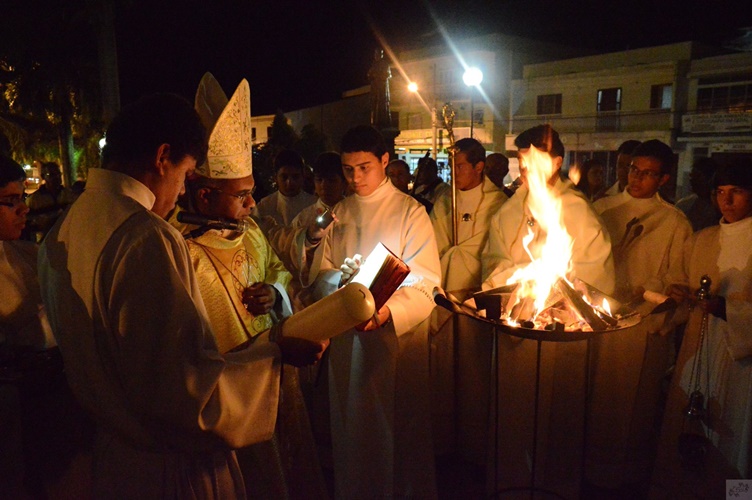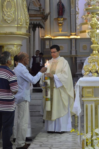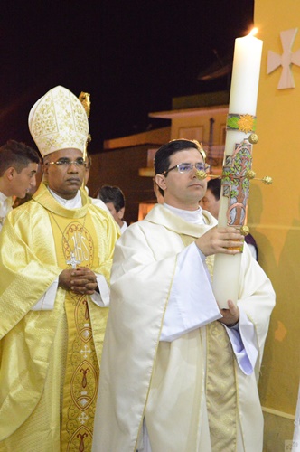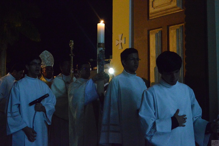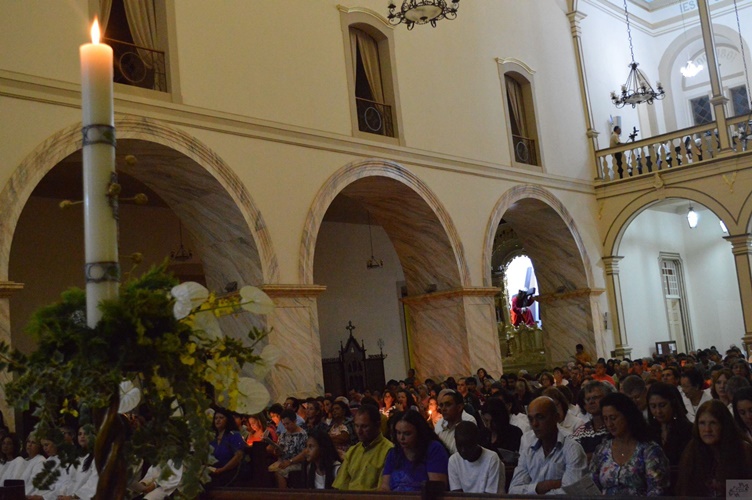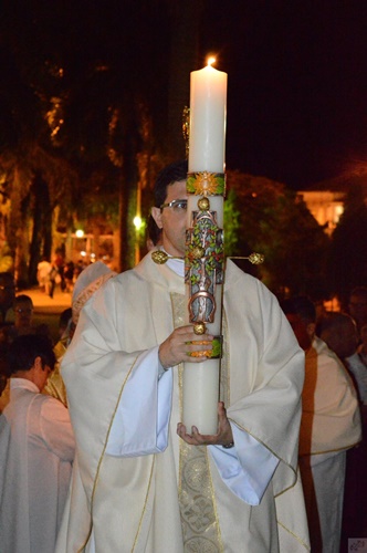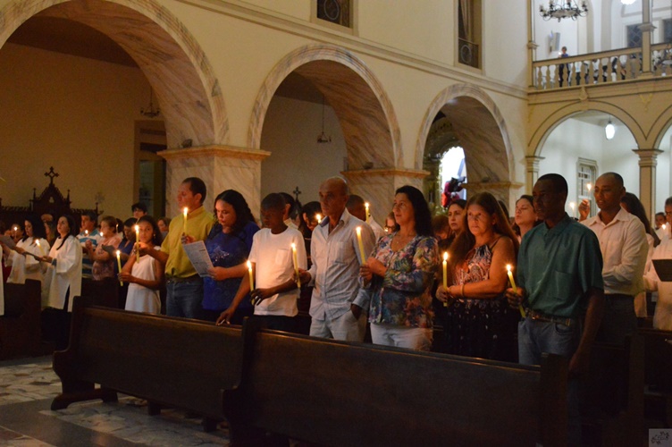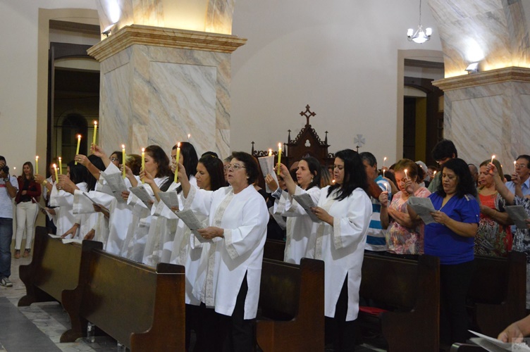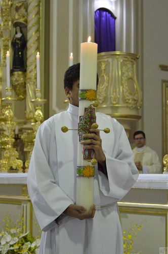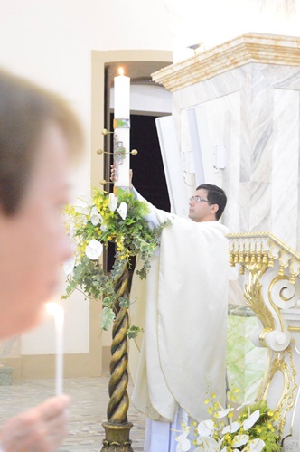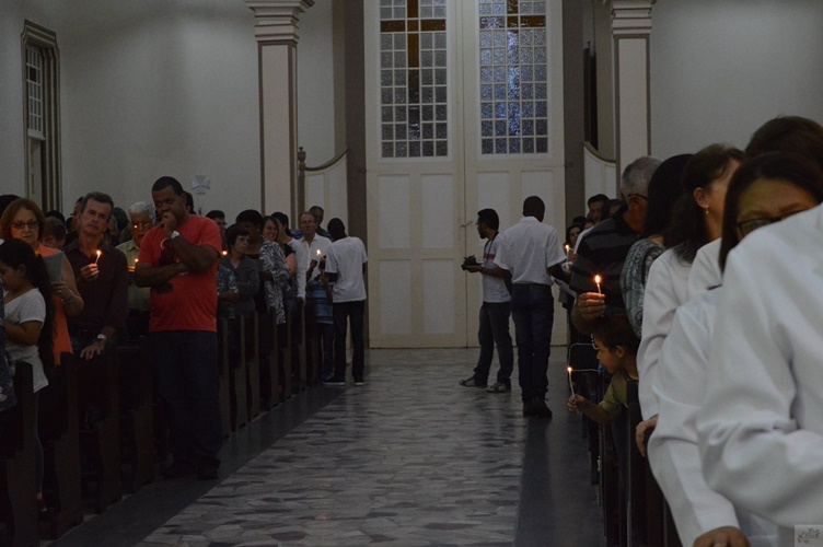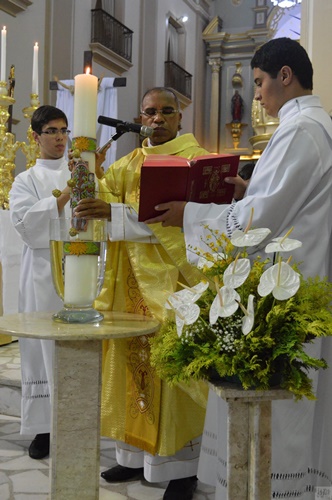 Ó noite de alegria verdadeira, que une de novo o céu e a terra inteira! Esse é o refrão de uma das melodias propostas para o Exultet, o precônio pascal, e sintetiza muito o espírito com que devemos participar e vivenciar esta celebração que é o ápice de toda a vida católica. A celebração foi presidida por D. Pedro Cunha Cruz e co-celebrada pelo vigário paroquial Pe. Edson Pereira de Oliveira. Participou a Irmandade do Santíssimo Sacramento, os Ministros da Comunhão além dos familiares e padrinhos dos quatro catecúmenos que receberam os sacramentos de iniciação cristã na celebração.