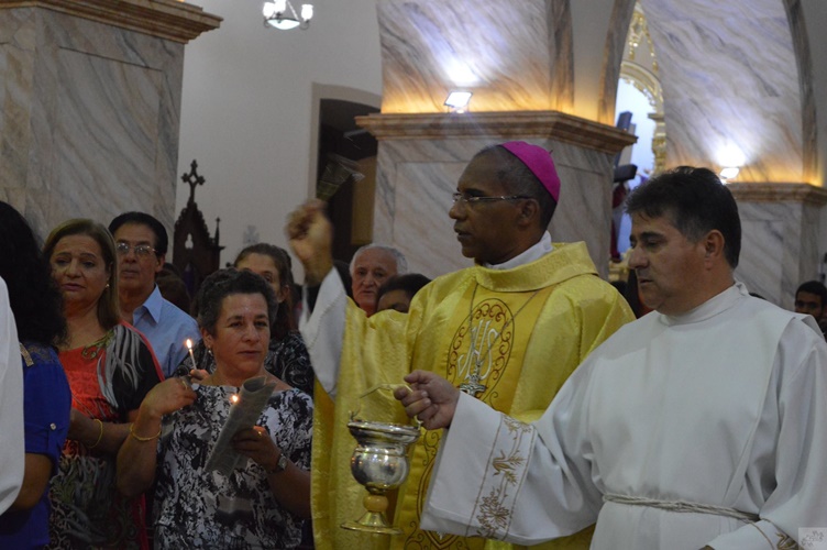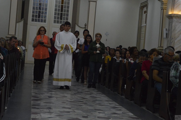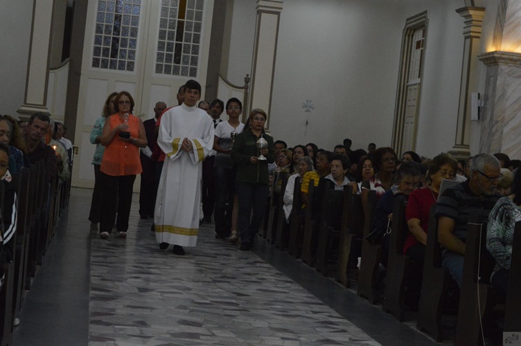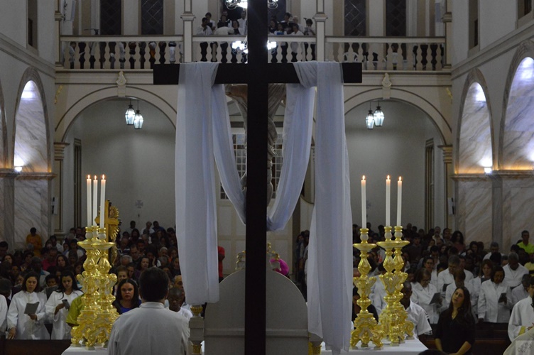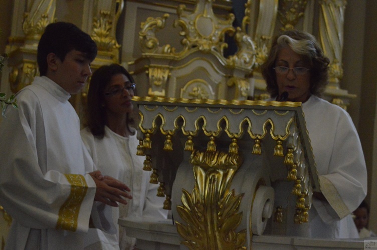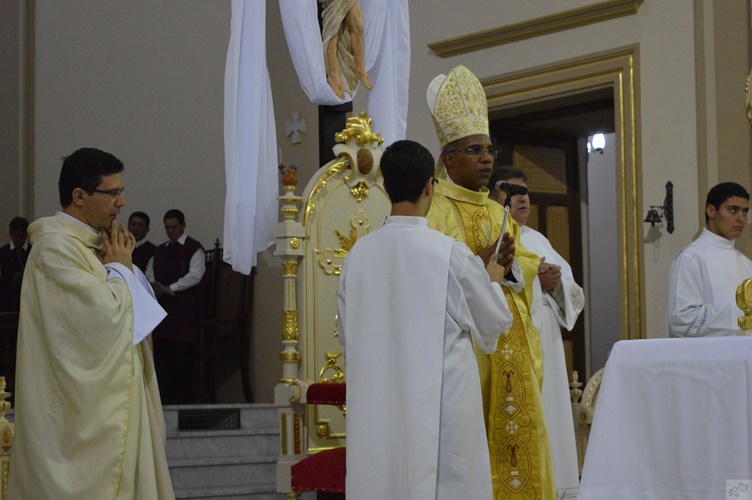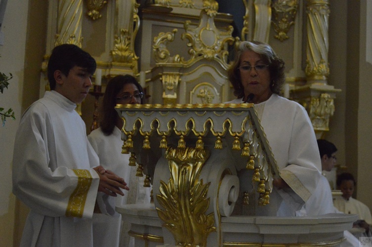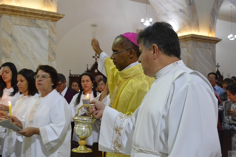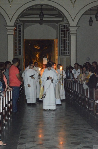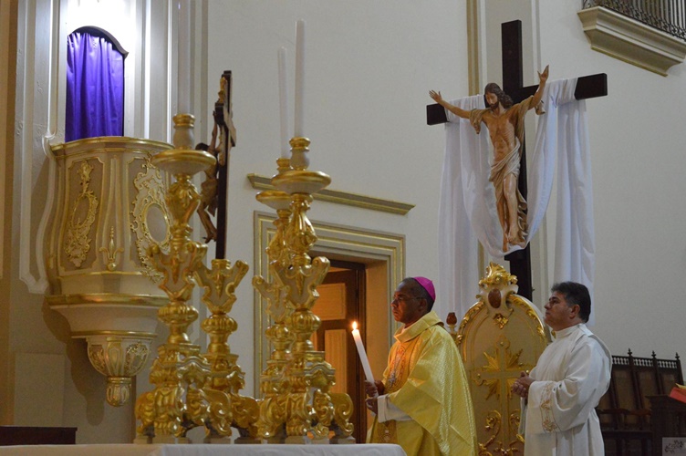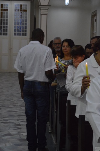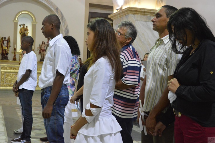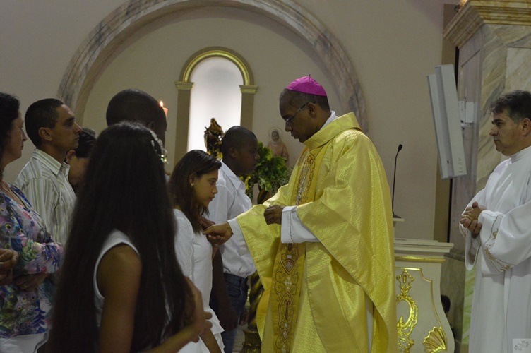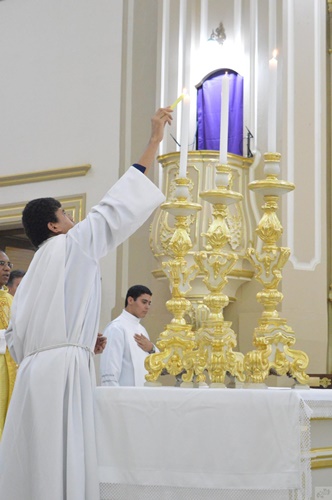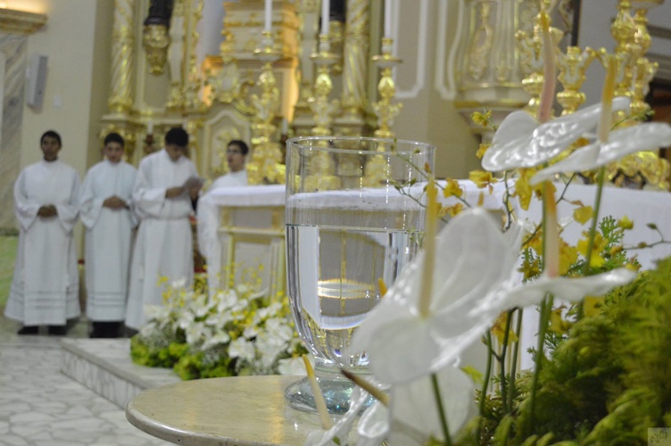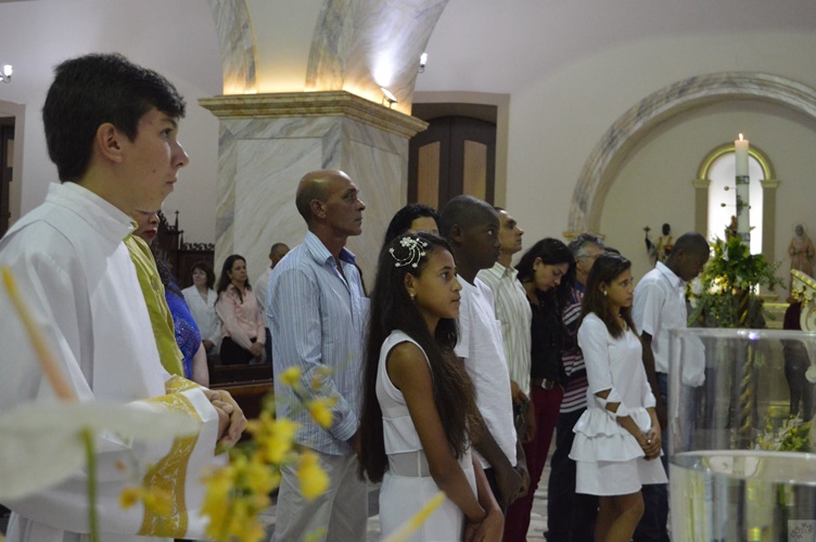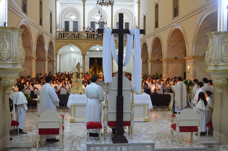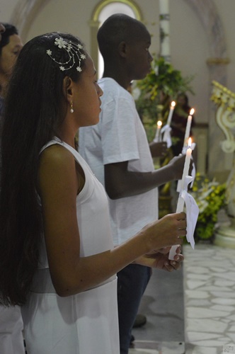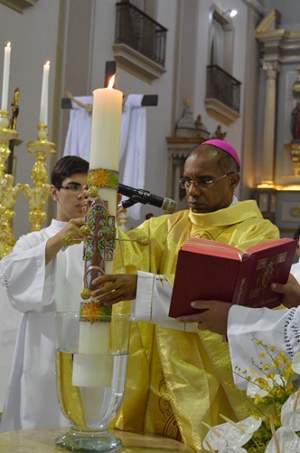 Ó noite de alegria verdadeira, que une de novo o céu e a terra inteira! Esse é o refrão de uma das melodias propostas para o Exultet, o precônio pascal, e sintetiza muito o espírito com que devemos participar e vivenciar esta celebração que é o ápice de toda a vida católica. A celebração foi presidida por D. Pedro Cunha Cruz e co-celebrada pelo vigário paroquial Pe. Edson Pereira de Oliveira. Participou a Irmandade do Santíssimo Sacramento, os Ministros da Comunhão além dos familiares e padrinhos dos quatro catecúmenos que receberam os sacramentos de iniciação cristã na celebração.