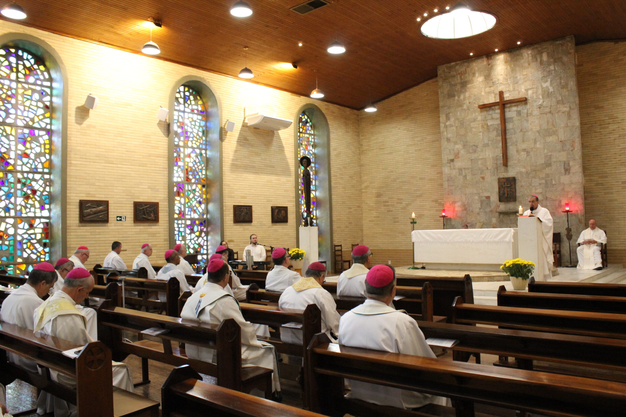 CapaNa manhã desta quarta-feira, 31 de maio, os arcebispos e bispos iniciaram as atividades do dia com a celebração da Eucaristia, que foi presidida pelo bispo de Itabira e Coronel Fabriciano (MG), Dom Marco Aurélio Gubiotti, ladeado pelo arcebispo de Diamantina (MG), Dom Darci José Nicioli, e Mons. José Hamilton de Castro, bispo nomeado para Almenara (MG).