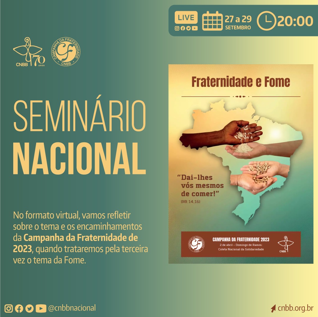 O Setor Campanhas da Conferência Nacional dos Bispos do Brasil (CNBB) realiza de 27 a 29 de setembro, de forma on-line, o Seminário Nacional da Campanha da Fraternidade 2023, cujo tema é “Fraternidade e Fome” e o lema “Dai-lhes vós mesmos de comer!” (Mt 14,16). A formação acontece nas três noites sempre a partir das 20h e poderá ser acompanhada no Youtube da CNBB e da Edições CNBB.