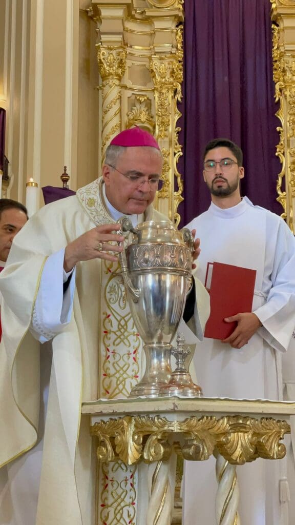 Por fim, acontece a consagração do Santo Crisma, o óleo mais solene da liturgia e aquele que dá nome à celebração. Diferente dos demais, o Crisma recebe a mistura de um bálsamo perfumado, simbolizando a presença suave e transformadora de Cristo. Esse óleo é utilizado nos sacramentos do Batismo, da Crisma e da Ordem, marcando os fiéis com o selo do Espírito Santo e inserindo-os profundamente no mistério pascal de Cristo morto e ressuscitado. A unção crismal expressa a dignidade real, sacerdotal e profética do cristão, chamado a irradiar no mundo o “bom perfume de Cristo”. É um gesto que une tradição, beleza e significado espiritual.