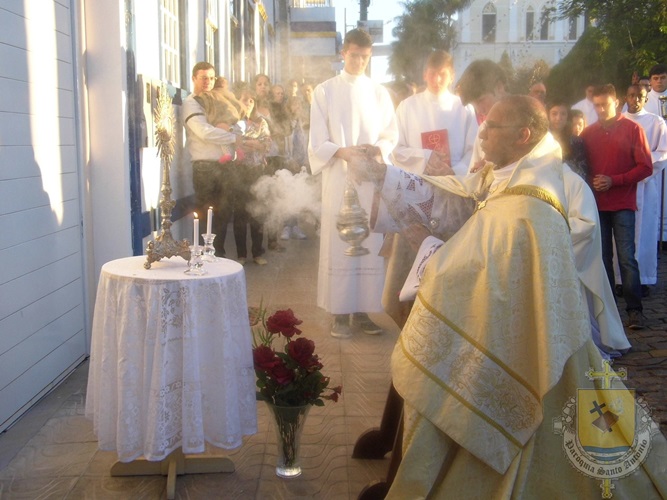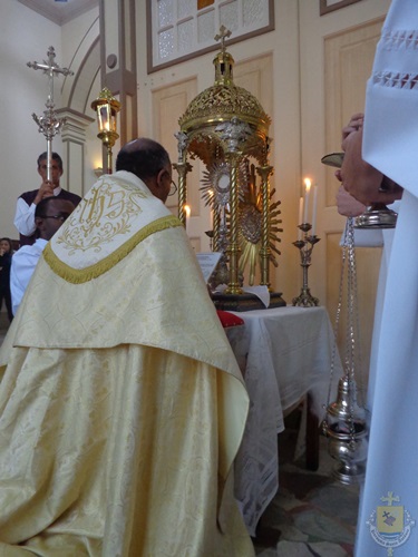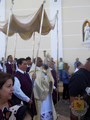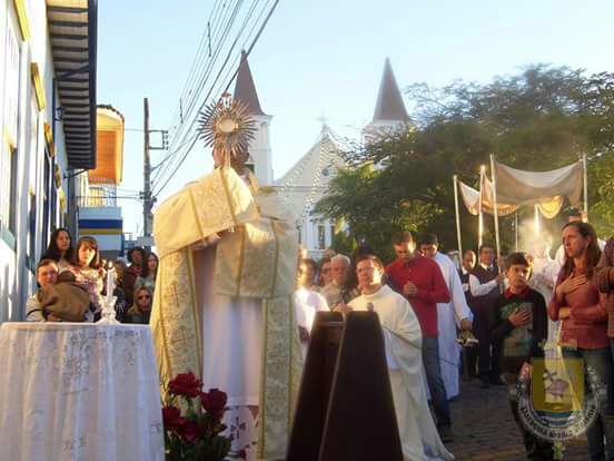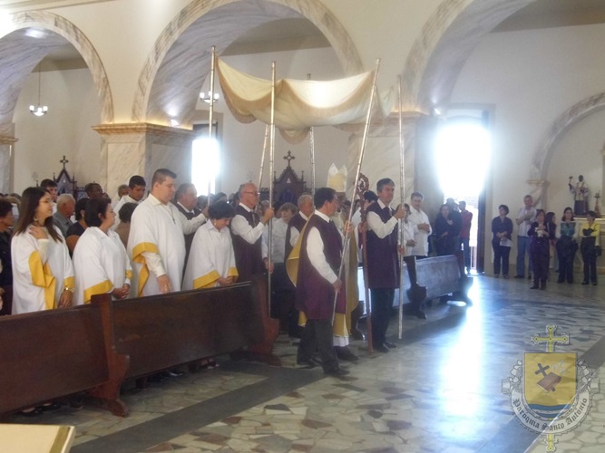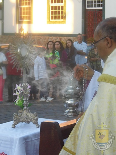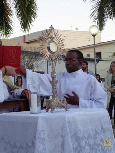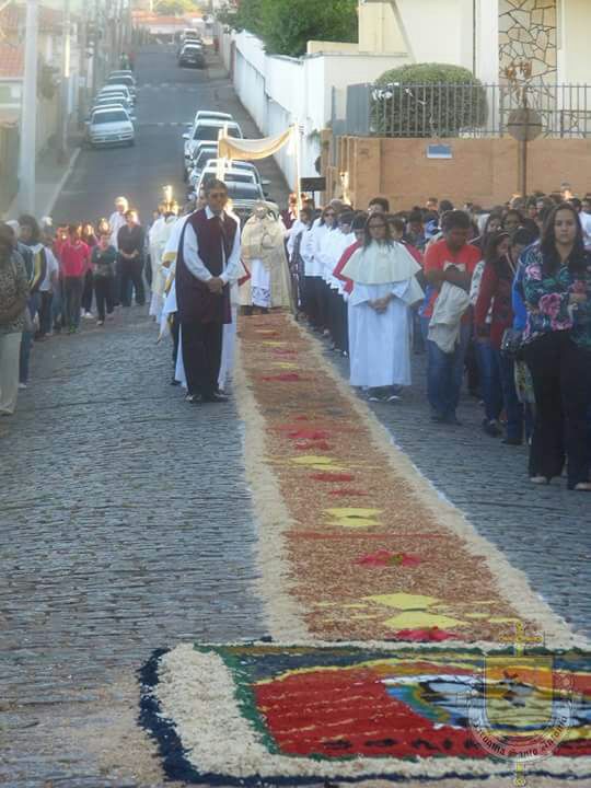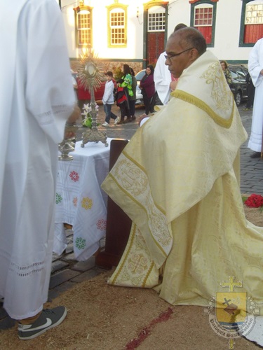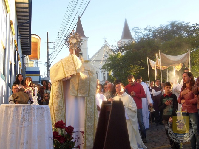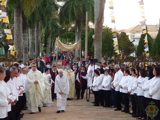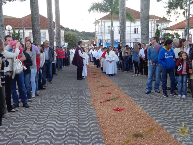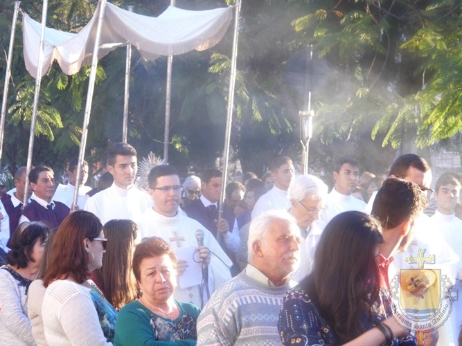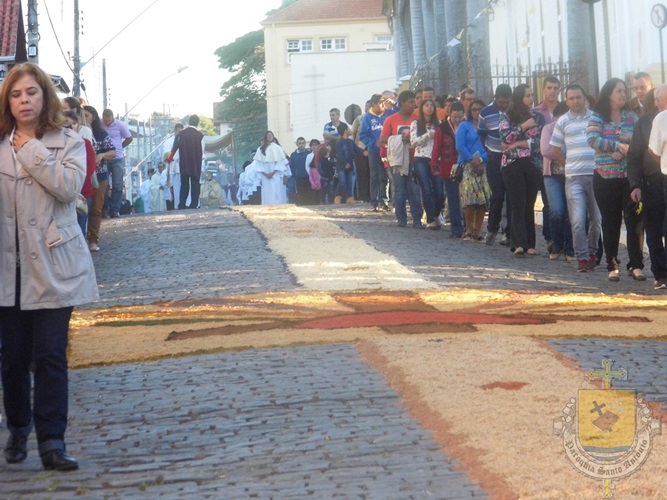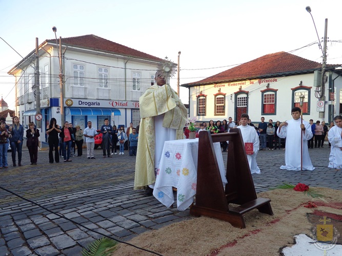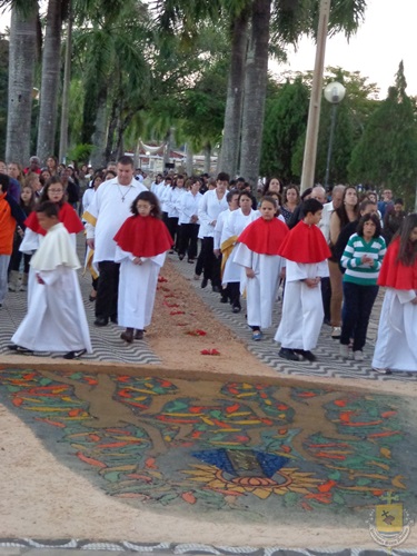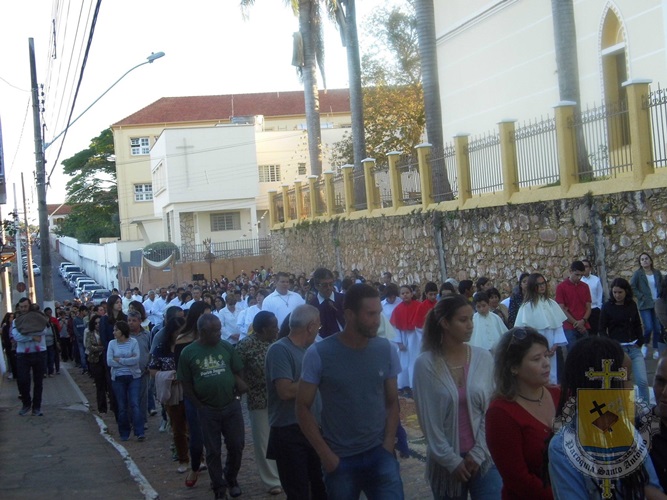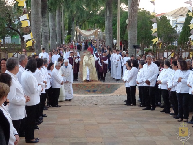 Após a missa solene das 15, os fiéis saíram em procissão pelas ruas da cidade. A procissão este ano aconteceu ao redor da praça D. Ferrão, onde está localizada a Catedral Santo Antônio. Durante o percurso, foram realizadas três paradas com a Bênção do SSmo. Sacramento. E quarta bênção foi realizada no retorno da procissão à Catedral. Animou a procissão com cânticos e orações, o vigário Paroquial, Pe. Edson.