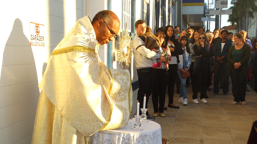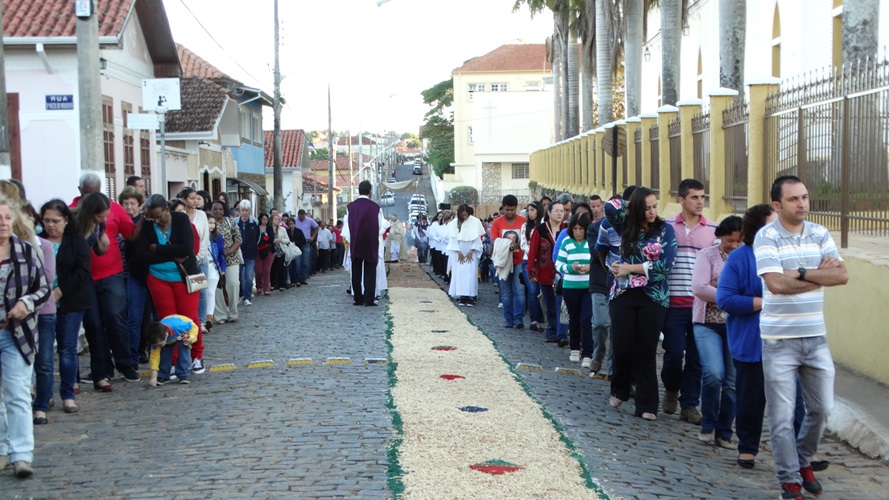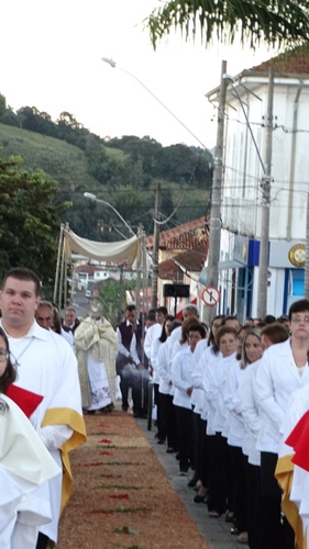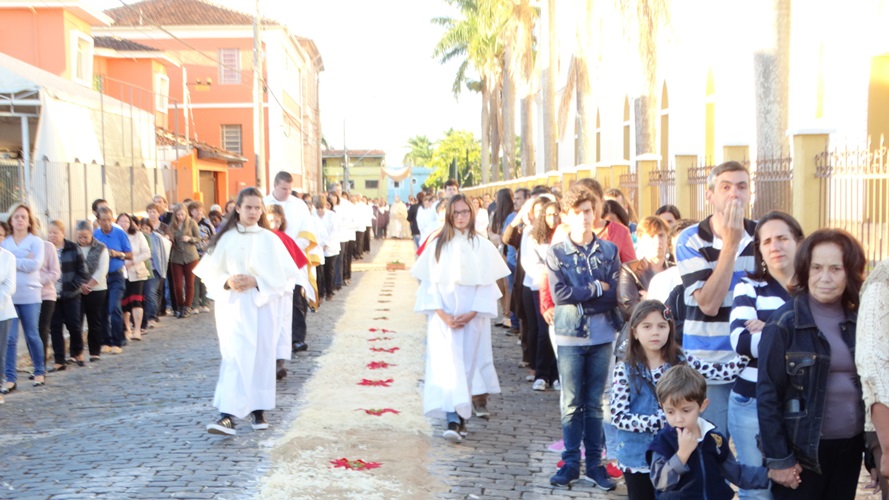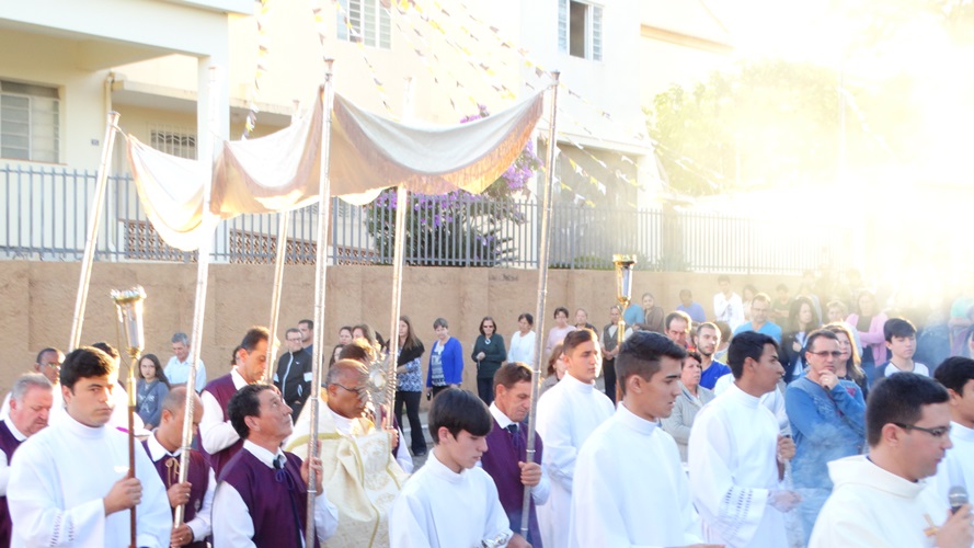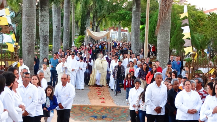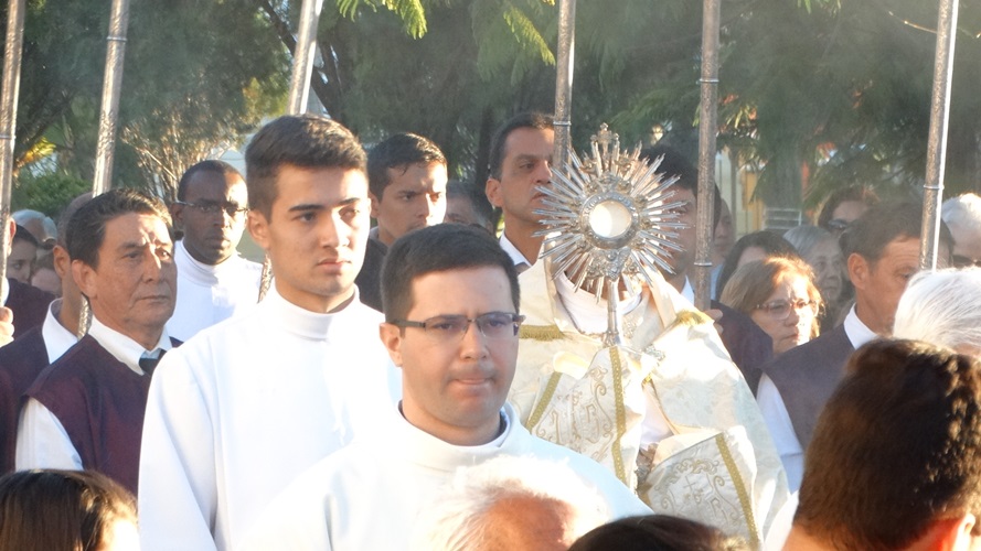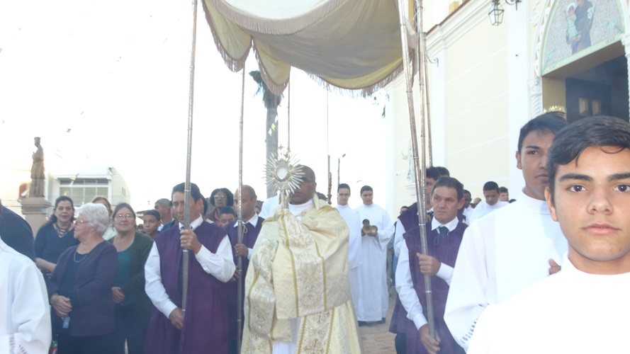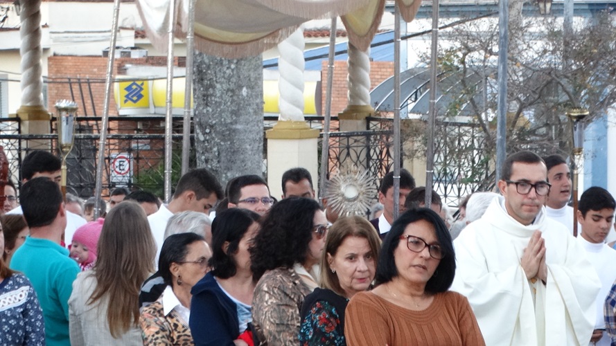 Após a missa solene das 15, os fiéis saíram em procissão pelas ruas da cidade. A procissão este ano aconteceu ao redor da praça D. Ferrão, onde está localizada a Catedral Santo Antônio. Durante o percurso, foram realizadas três paradas com a Bênção do SSmo. Sacramento. E quarta bênção foi realizada no retorno da procissão à Catedral. Animou a procissão com cânticos e orações, o vigário Paroquial, Pe. Edson.