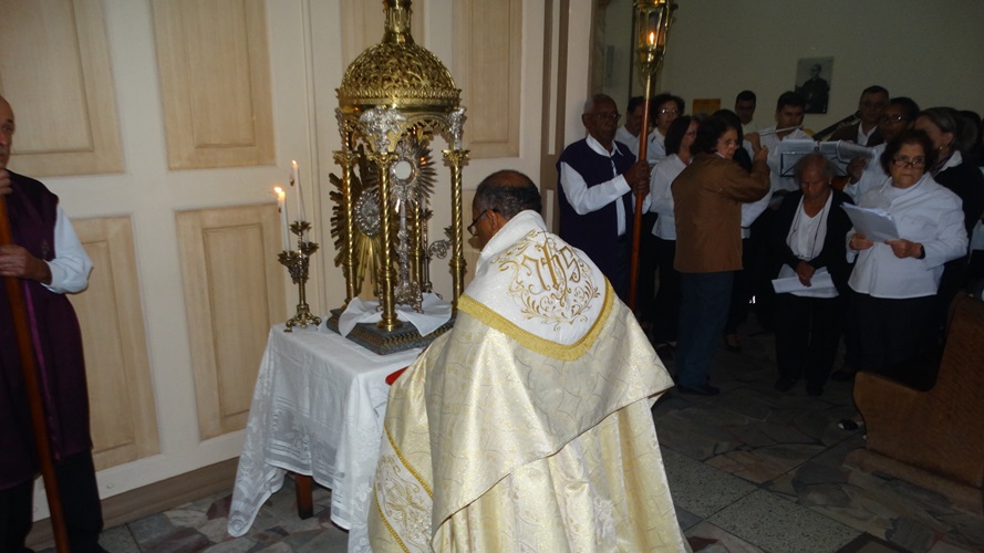 “Nós poderíamos falar a tarde inteira, entrando pela noite, desta Sequência! [Lauda Sion hino composto por São Tomás de Aquino] […] ‘Se não vês nem compreendes, gosto e vista tu transcendes, elevado pela fé’. A fé faz transcender o fato de você ter que ver Jesus fisicamente naquele pedaço branco de pão. É aquilo que você não vê pelo olhar físico, o olhar da fé enxerga! Se você não consegue enxergar a presença do Cristo ali, pois é um mistério, sua fé não está bem sustentada! Eu me lembro de um padre espanhol, com quem fiz a minha primeira Eucaristia, eu tinha de 9 para 10 anos. Ele dizia assim: ‘Vocês vão receber o corpo e o sangue do Senhor, não se impressionem! O gosto vai ser o mesmo!’ E ele dava, antes mesmo da primeira Eucaristia, a hóstia não consagrada. Não dava vinho, pois éramos menores, para que nós sentíssemos o gosto. E dizia: “O que eu estou dando para você não é o corpo do Senhor. Esta hóstia que estou dando para você é apenas trigo com a água! É apenas para vocês sentirem o gosto. No dia da primeira comunhão de vocês vão sentir esse mesmo gosto: do trigo e da água. Só que vocês vão sentir a presença do Cristo!’ O que nós sentimos é uma coisa; o que a nossa fé percebe é outra! ‘Pão e vinho, eis o que vemos; mas ao Cristo é que nós temos’”