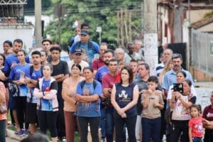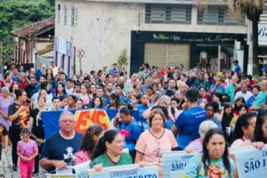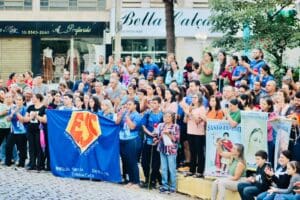 Após serem acolhidos com um café da manhã comunitário, na Praça de Esportes Major Toledo, partiram todos em Procissão, com as
